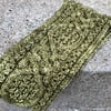 Cabled section (98 rows and including i-cord edges): 5.5 in. (14 cm) wide and13.75 in. (35 cm) long, blocked
