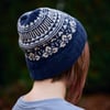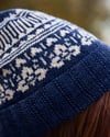 This hat is constructed from the bottom up and is worked in one piece. After working the folded ribbed brim, the body of the hat is worked with the stranded colorwork technique. A chart for the colorwork is provided. Written instructions for the chart are also included.