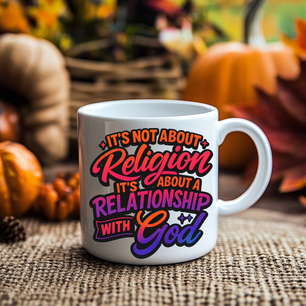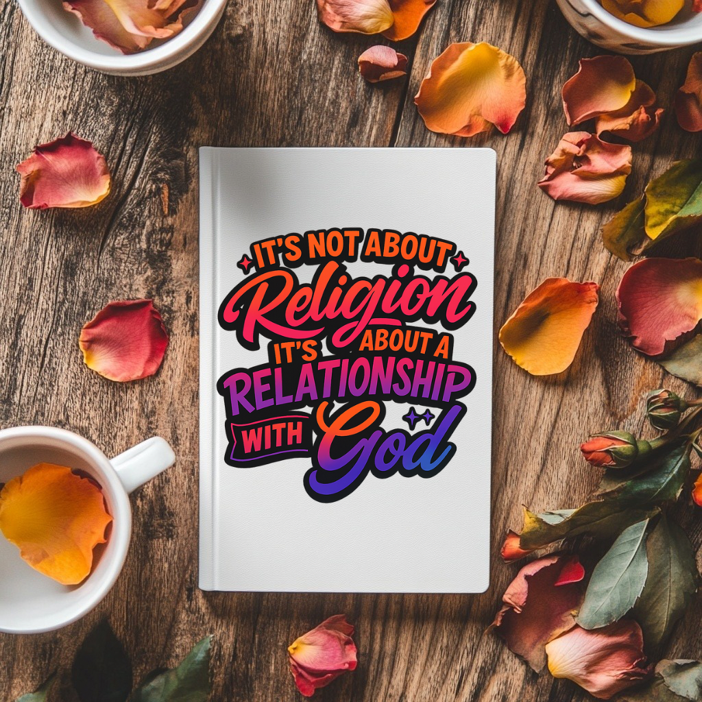 This bold and inspiring Christian design blends bright pink, orange, and purple gradient tones with smooth shadowing for a modern look that glows with faith. It’s the perfect message for anyone who values relationship over religion — reminding us to stay grounded in grace and connection.