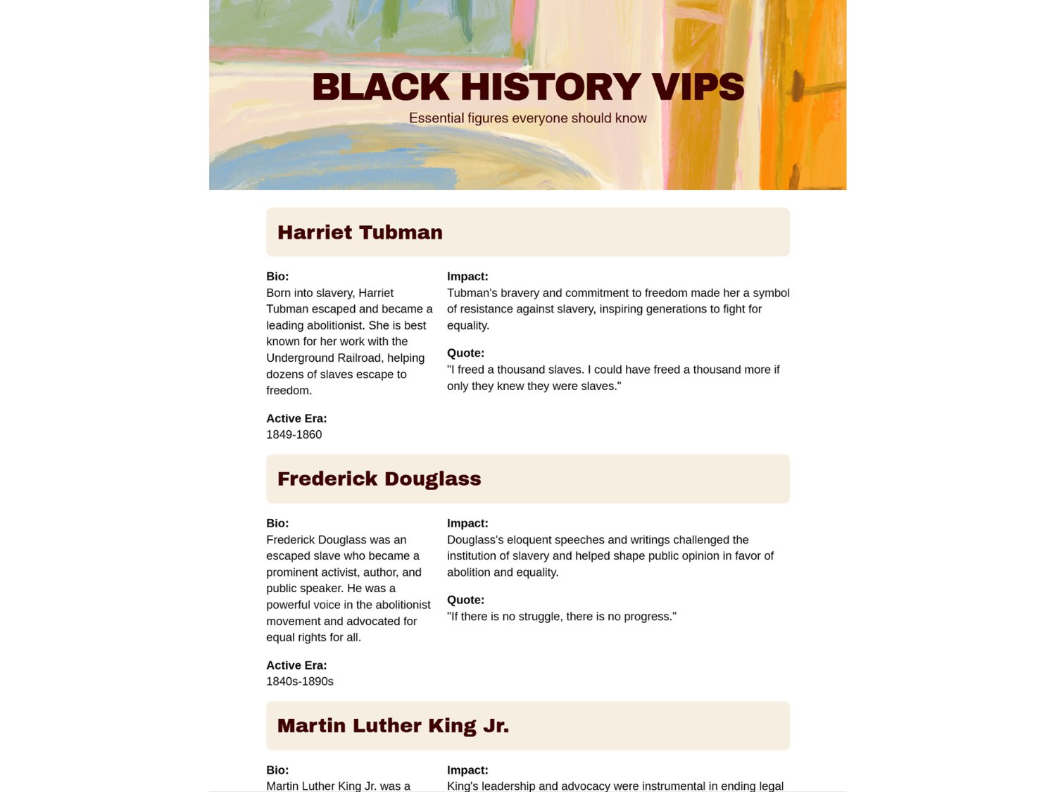 This guide gives you quick, clear snapshots of key VIPs — their lives, legacies, and how they shaped the nation. Perfect for students, lifelong learners, parents, educators, and anyone who wants a deeper appreciation for Black history in just minutes.
