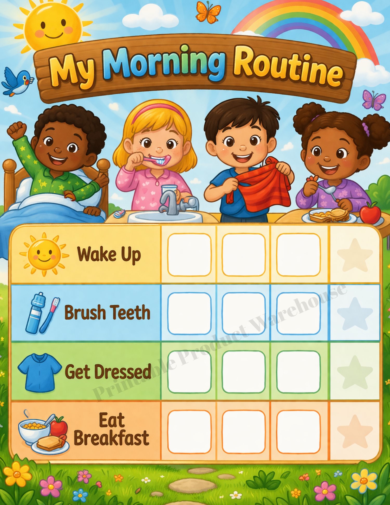 This colorful morning routine chart helps kids stay on track with daily tasks like brushing teeth, getting dressed, and eating breakfast.