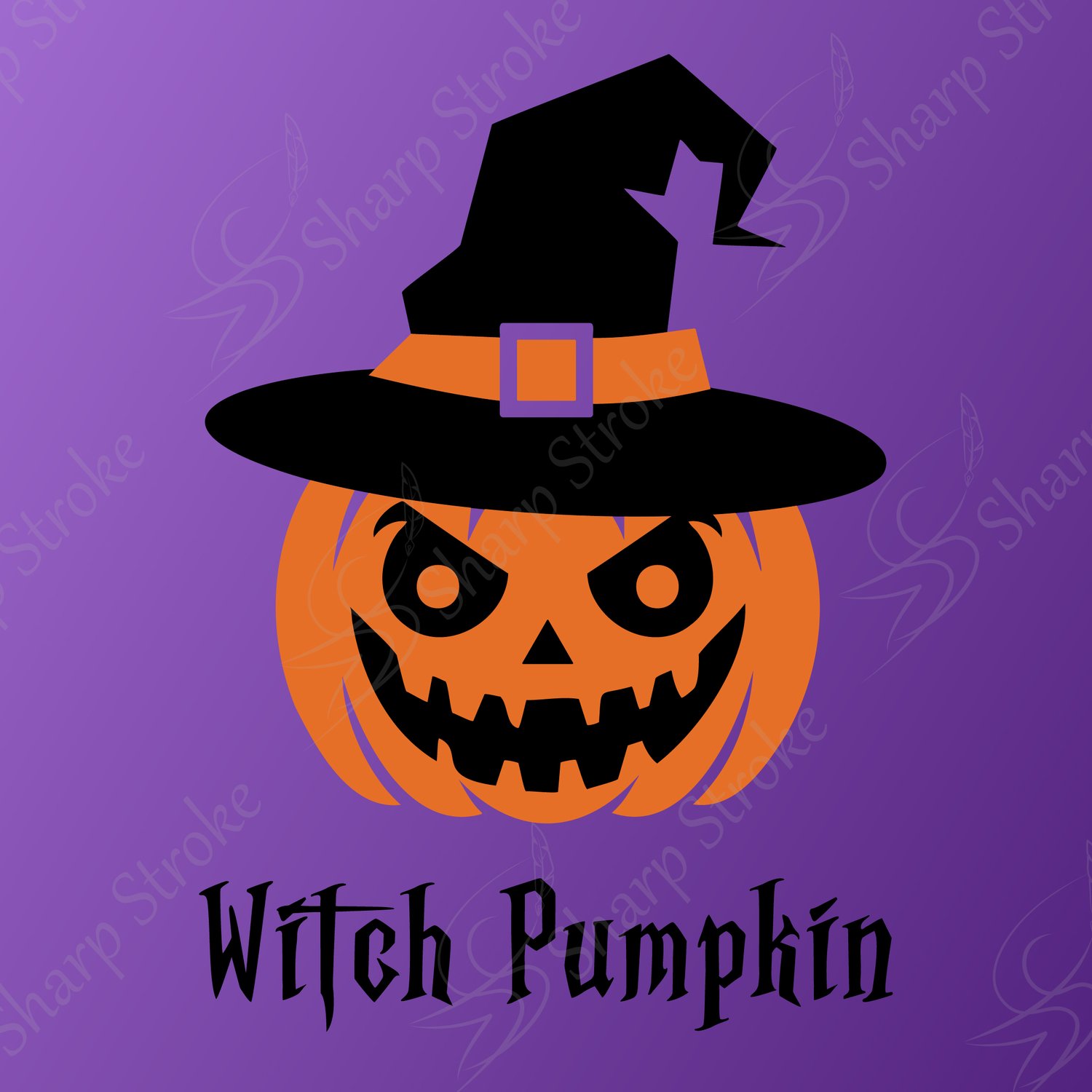 This design features a spooky pumpkin with sharp teeth set on a purple background, wearing a classic witch’s hat — a fun, creepy touch for any project.