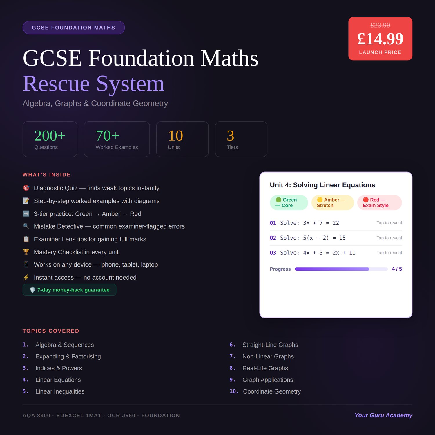Complete 10-unit GCSE Foundation Maths revision course. 224+ practice questions, 70+ worked examples, 3 difficulty tiers per unit. Covers all Algebra & Graphs topics for Foundation tier. Instant access after payment. Works on any device. AQA 8300 / Edexcel 1MA1 / OCR J560.