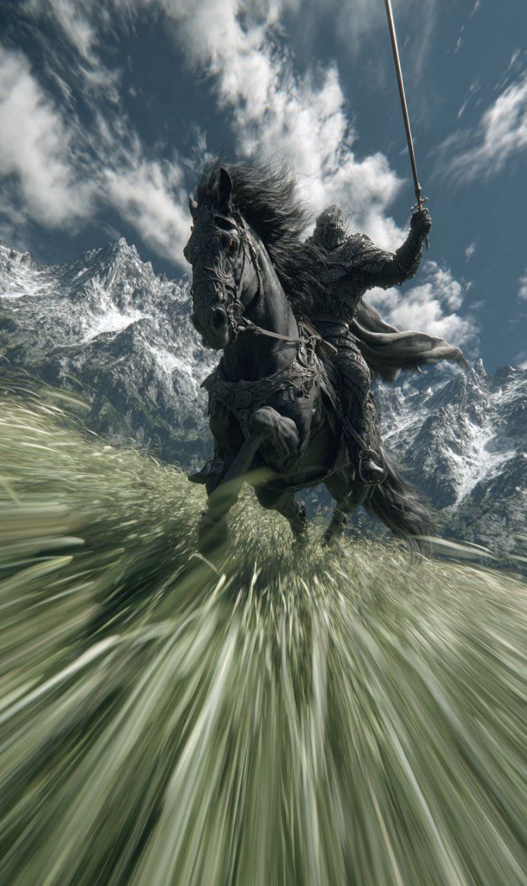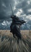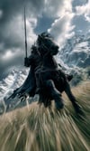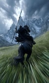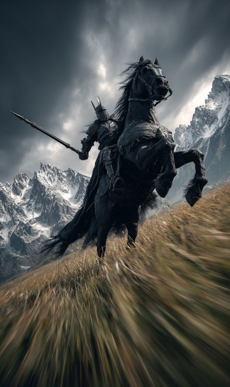 Epic dark fantasy POV prompt. Charging warhorse rearing up, obsidian armored knight with lance, dramatic storm clouds over mountain peaks. Ultra-wide angle with motion blur and cinematic lighting.