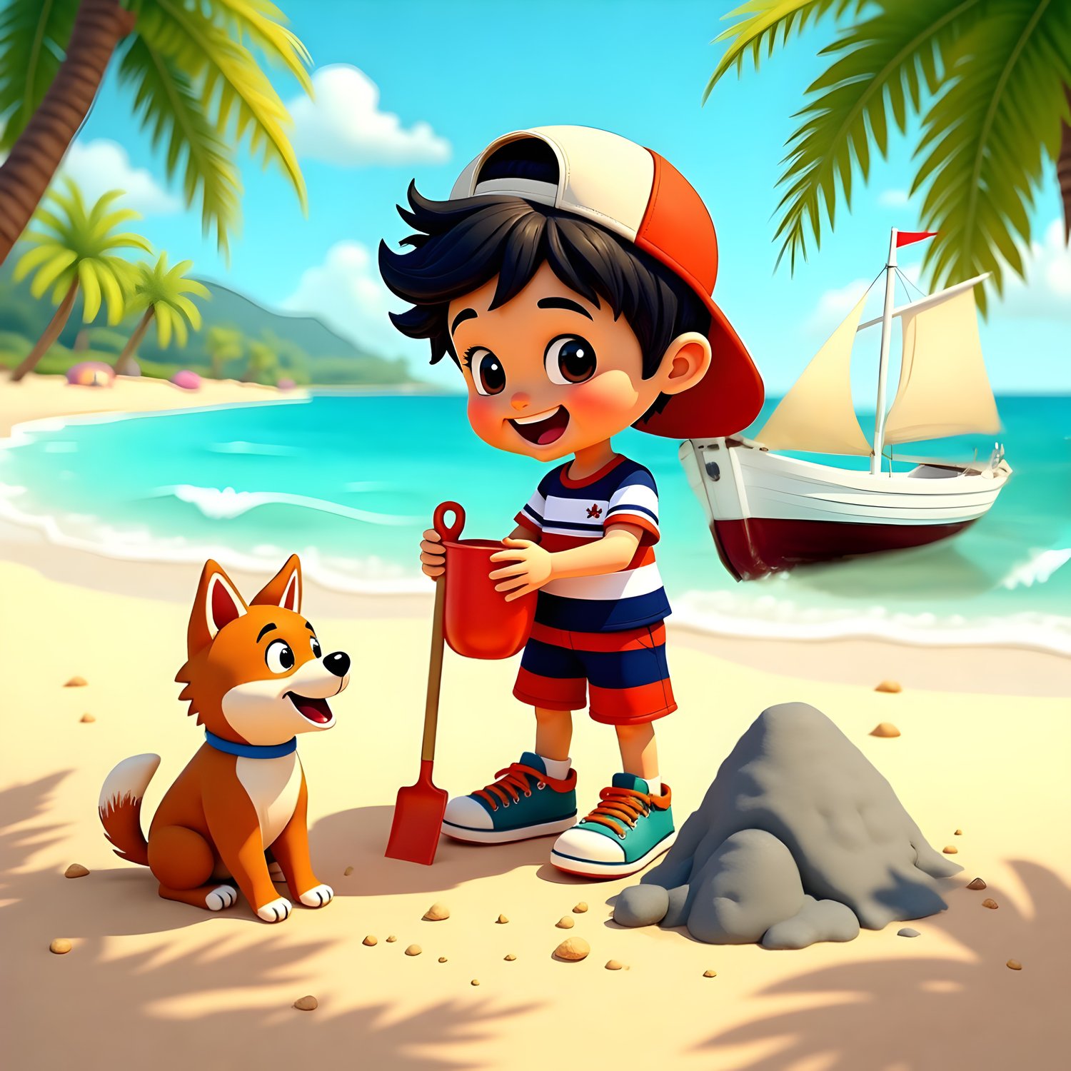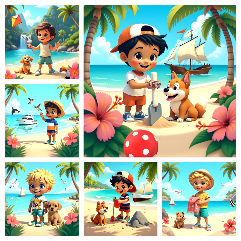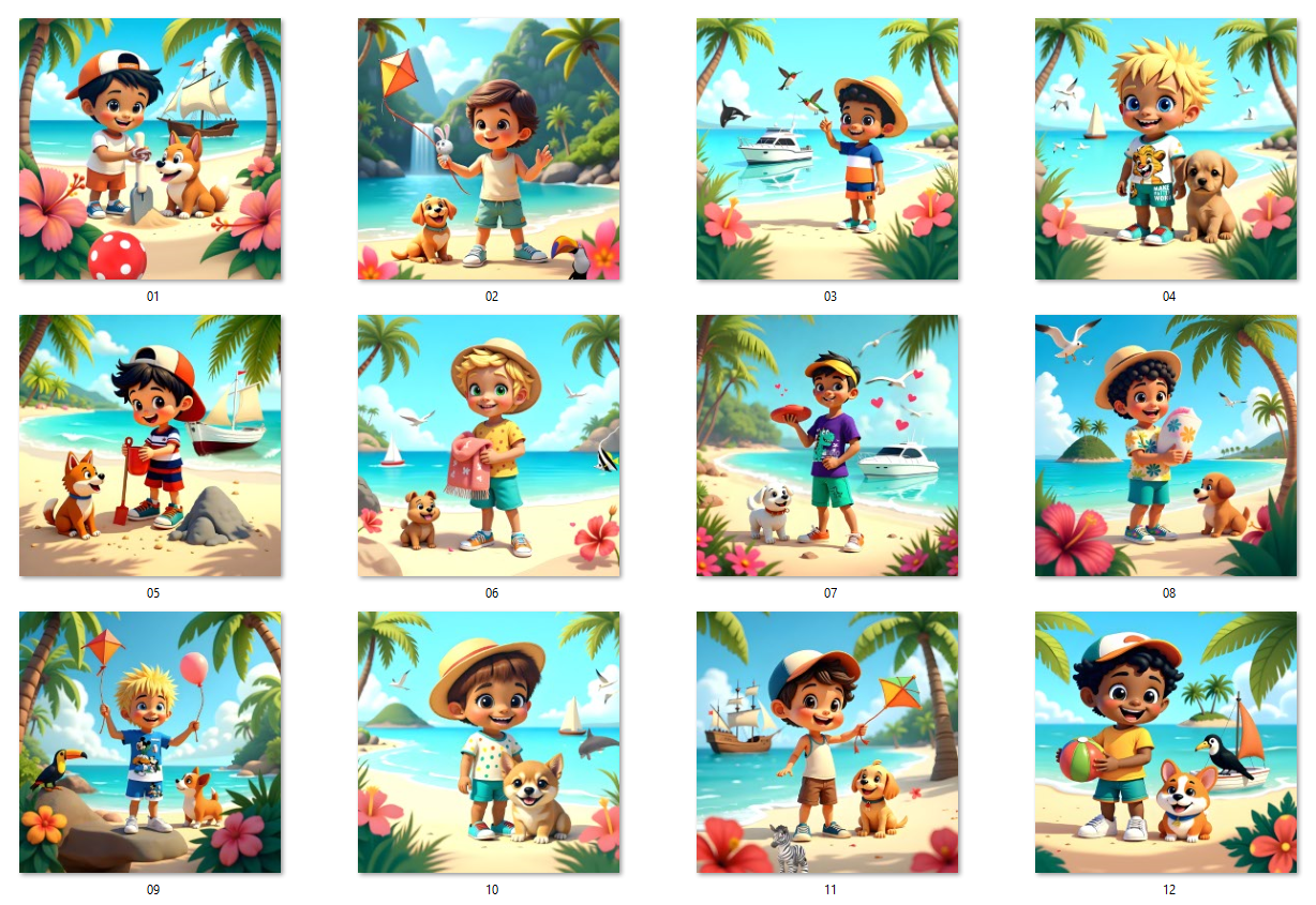 12 AI-generated JPG digital art prints – Summer Kids Boys – 12 Tropical Beach Art Prints, digital download, kids wall art. High resolution 300 DPI, square format, 3600x3600 pixels, ready for print or digital use. Instant download, no physical product. Commercial license included.