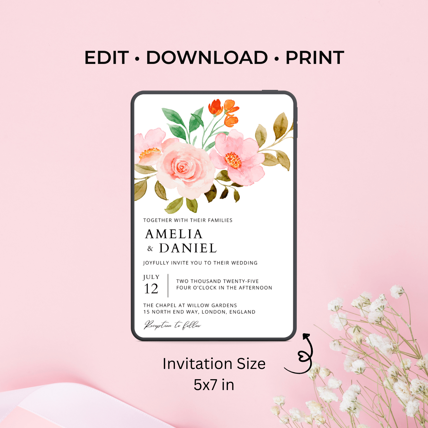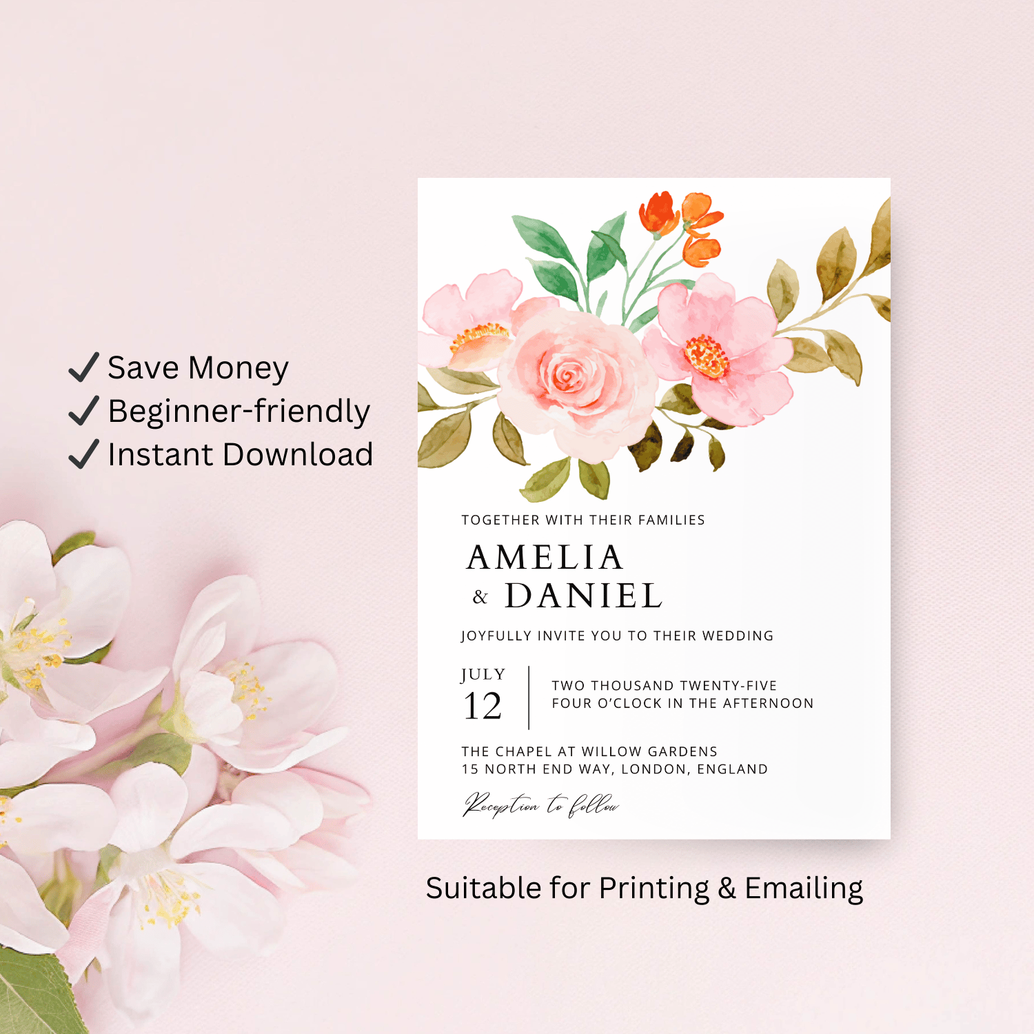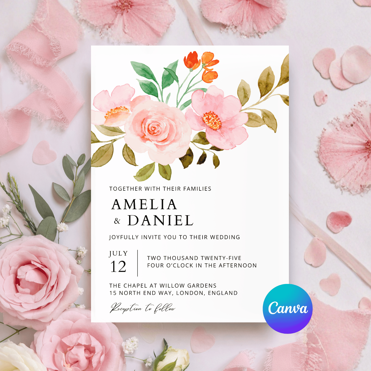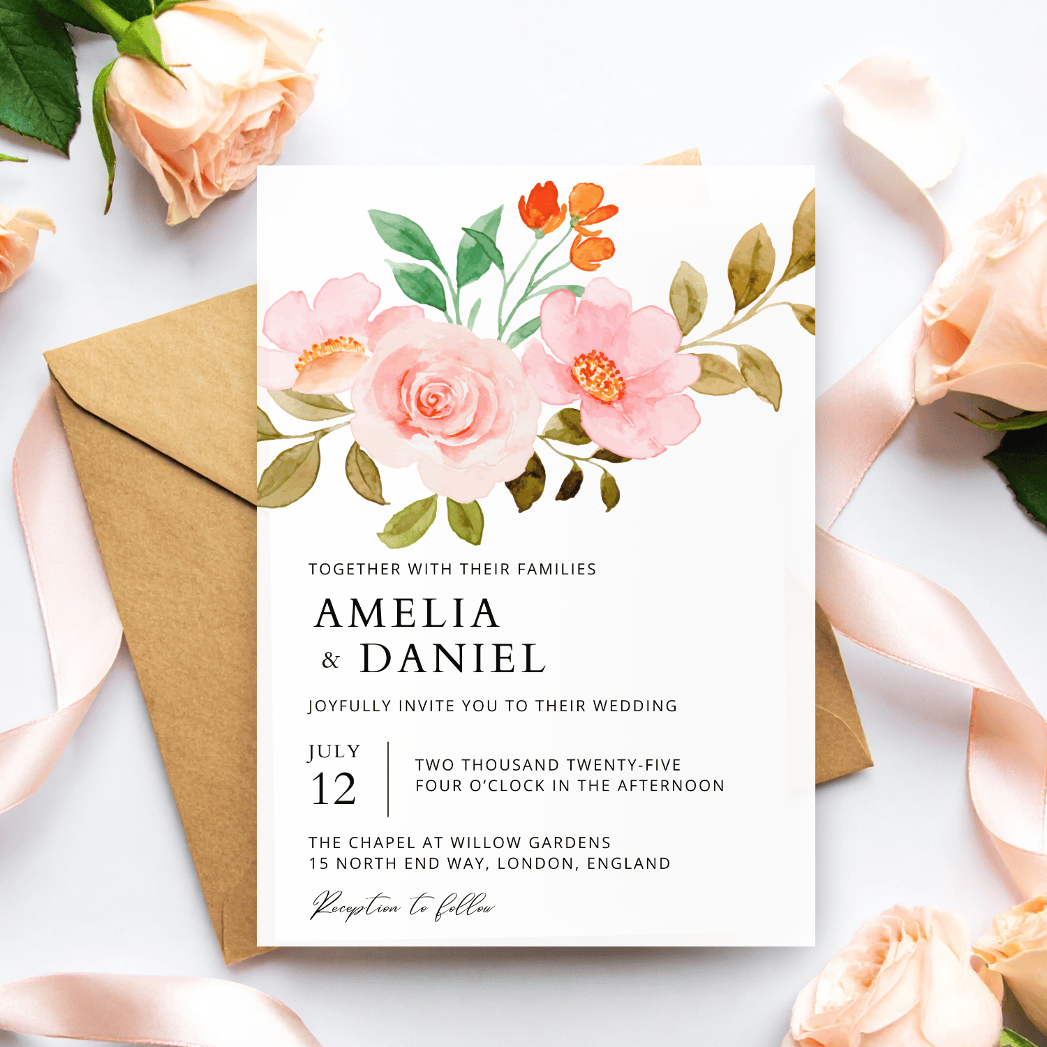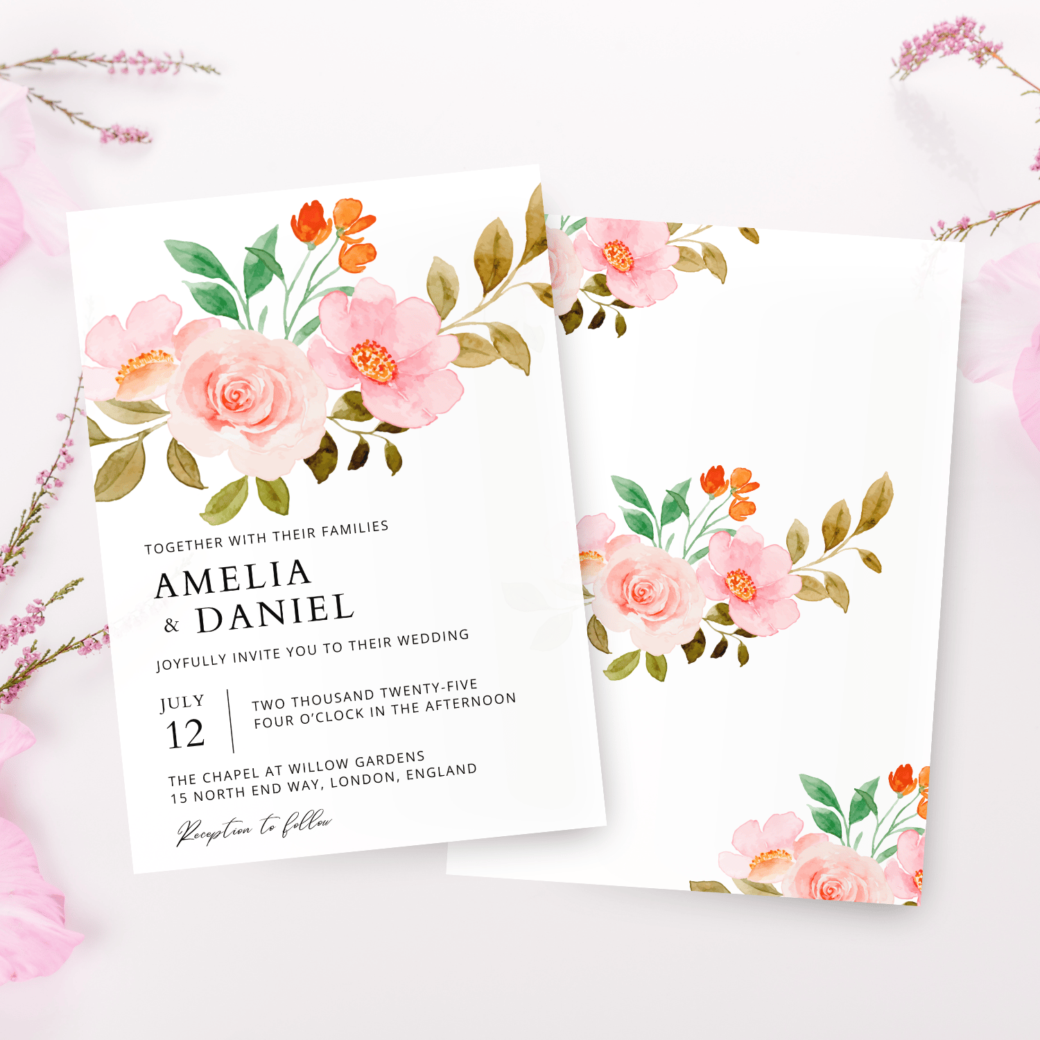 This peach rose floral wedding invitation template is designed for couples who want an elegant look they can customize themselves. The romantic and timeless design is perfect for garden weddings, boho celebrations, and classic ceremonies.