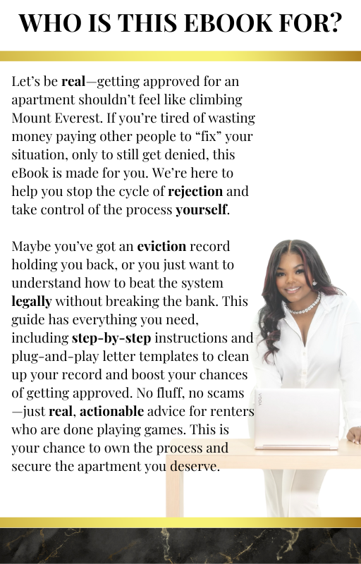 Struggling to secure an apartment? This comprehensive guide is packed with apartment approval tips and strategies to help you succeed. Whether you're battling eviction records, struggling with rental application hacks, or need to improve your rental profile, this eBook provides actionable steps for success.