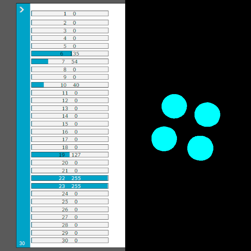 * En el modo de 24CH Verifique, con el Fixture de pruebas de 30CH (click), que coincidan estos canales: 6 en el valor 135 = Lámpara ON, 23 Dimmer, 22 Shutter / Strobo, 7 en el valor 54 = Color Celeste, 10 en el valor 40 = Gobo de 4 círculos, 19 Foco (ver tercer foto).