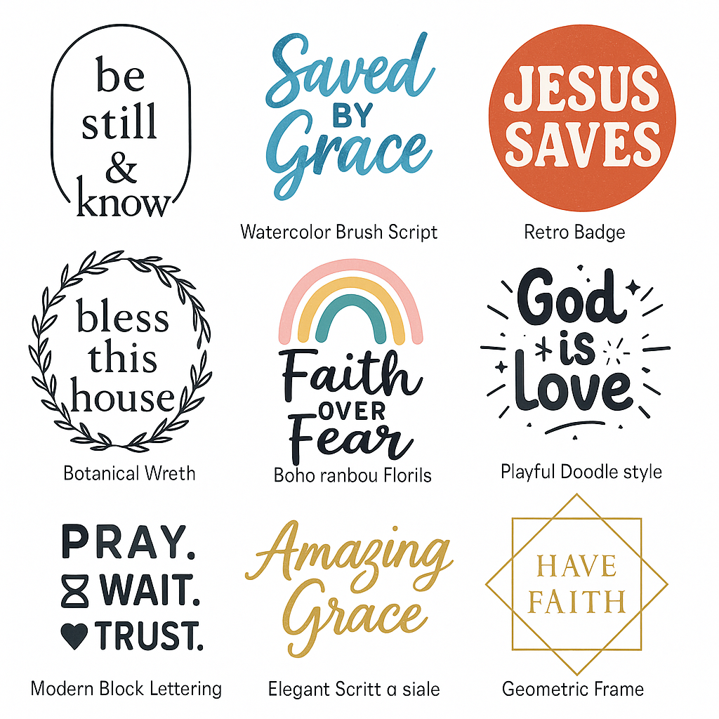 - 40 faith-based inspirational quotes in a variety of artistic styles, ideal for Bible journaling, church events, gifts, shirts, mugs, wall art, and more.