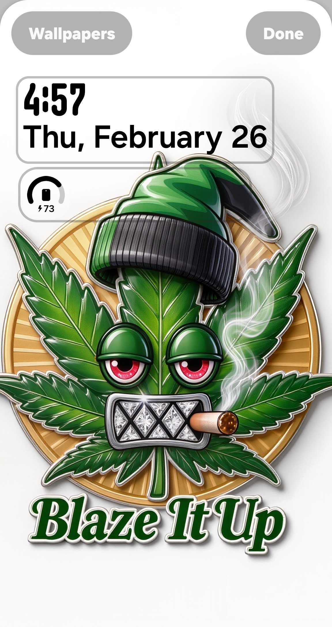 This dynamic design features a sleek emerald-toned flame character wearing a modern beanie, framed by layered green leaf elements and a radiant gold medallion backdrop. The silver grill detailing and ember glow add strong contrast and visual depth without overpowering your lock screen layout.