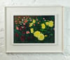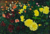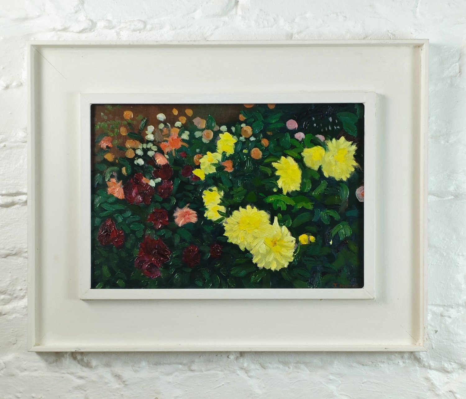 Painted from life in the Abbey gardens, showing dahlias in full bloom in late summer. Deep reds, yellows, and greens capture the vibrancy of the season.