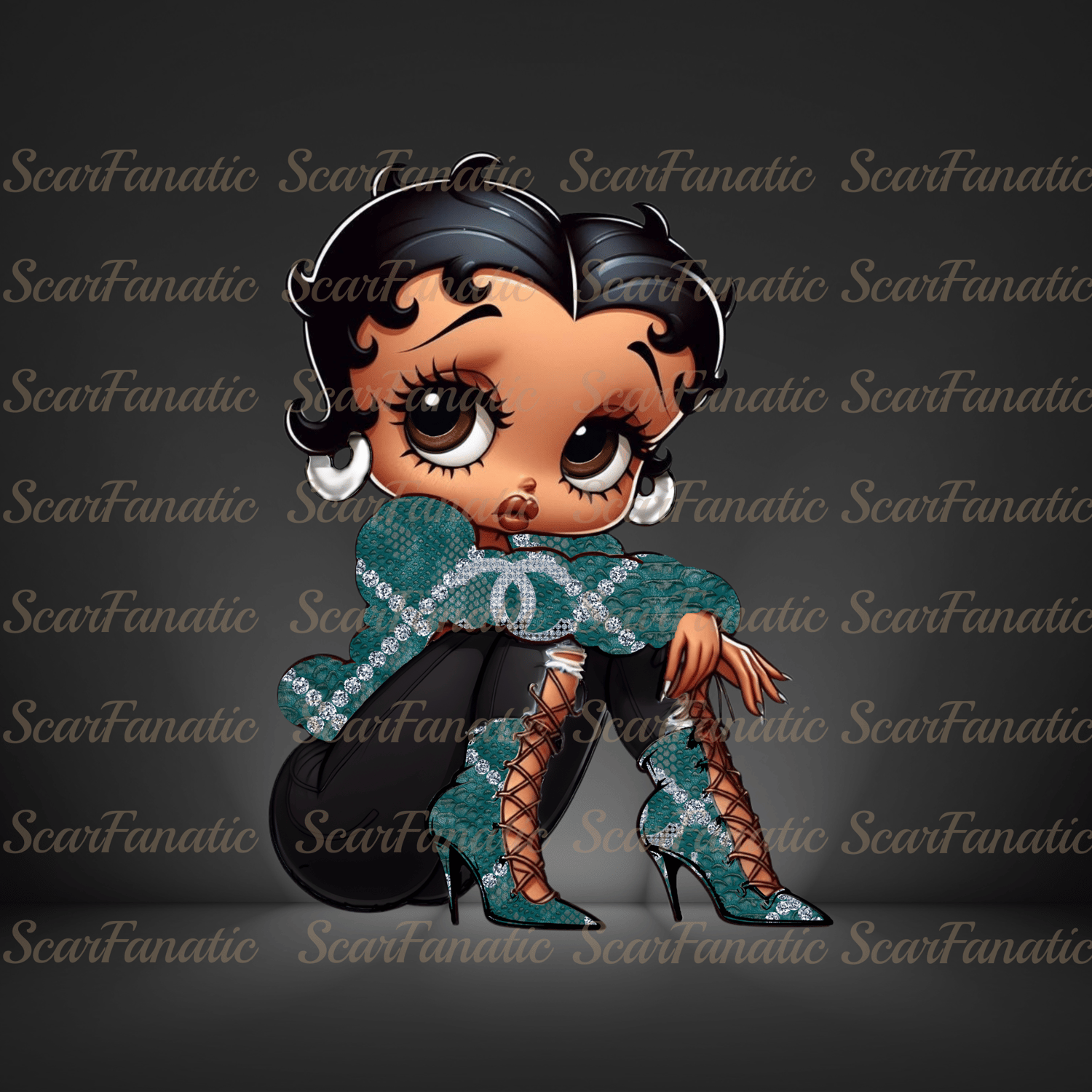 Black Betty Boop in bright teal snakeskin jacket and heels, black jeans, high heel boots, Sublimation, PNG, DTF, 300DPI, high resolution