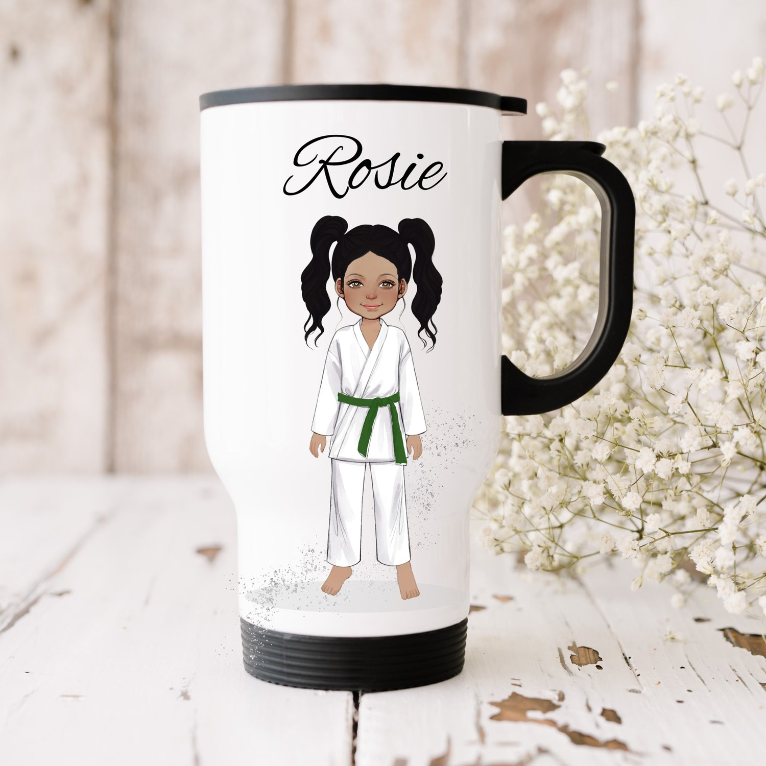 Presenting "Rosie Goes to Karate," featuring characters with three skin tones, four hair colors, and three eye colors to mix and match. Included are brown, yellow, black, blue, green, red, and orange belts.