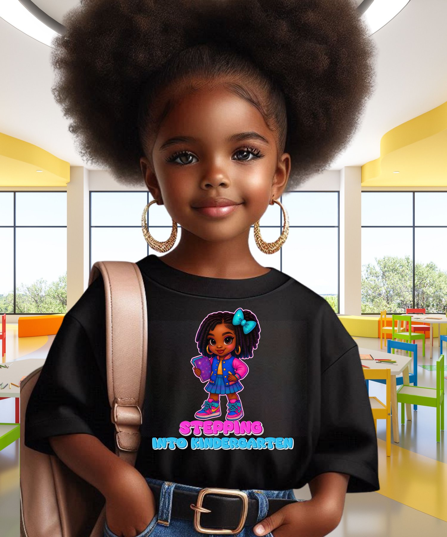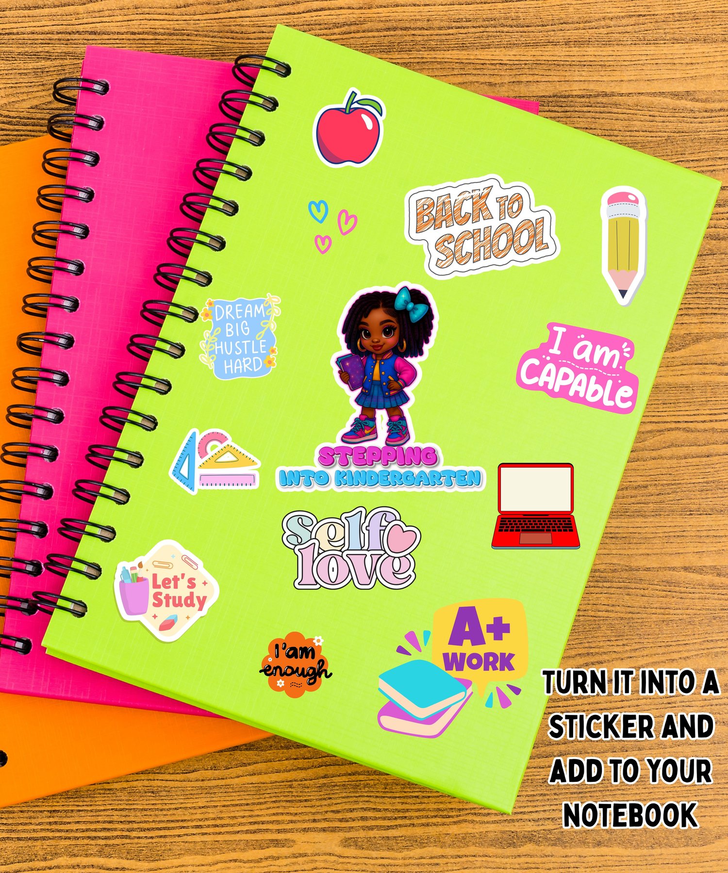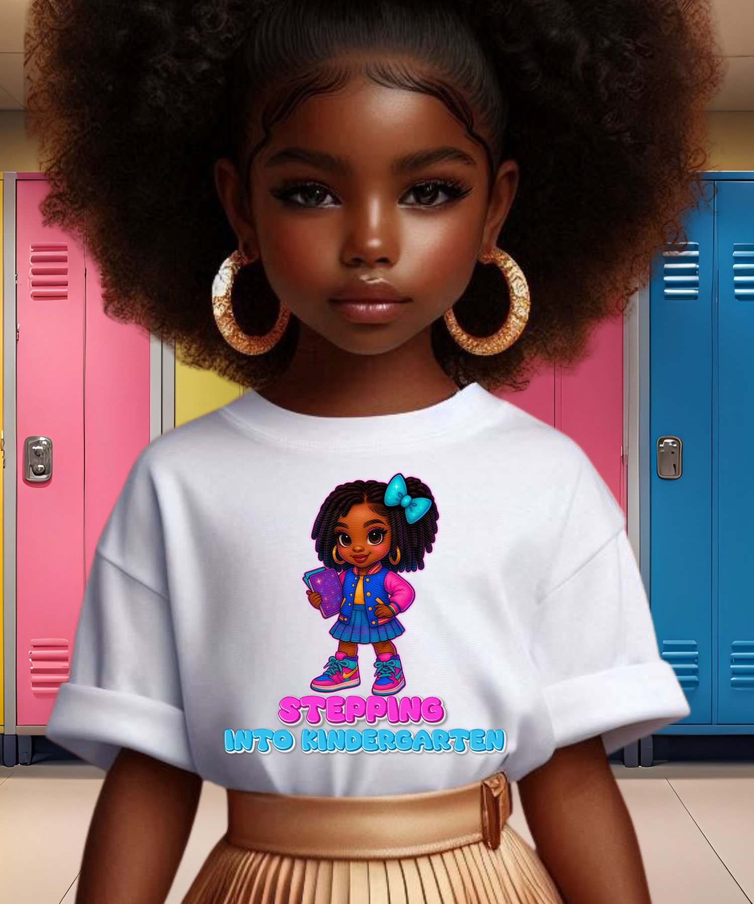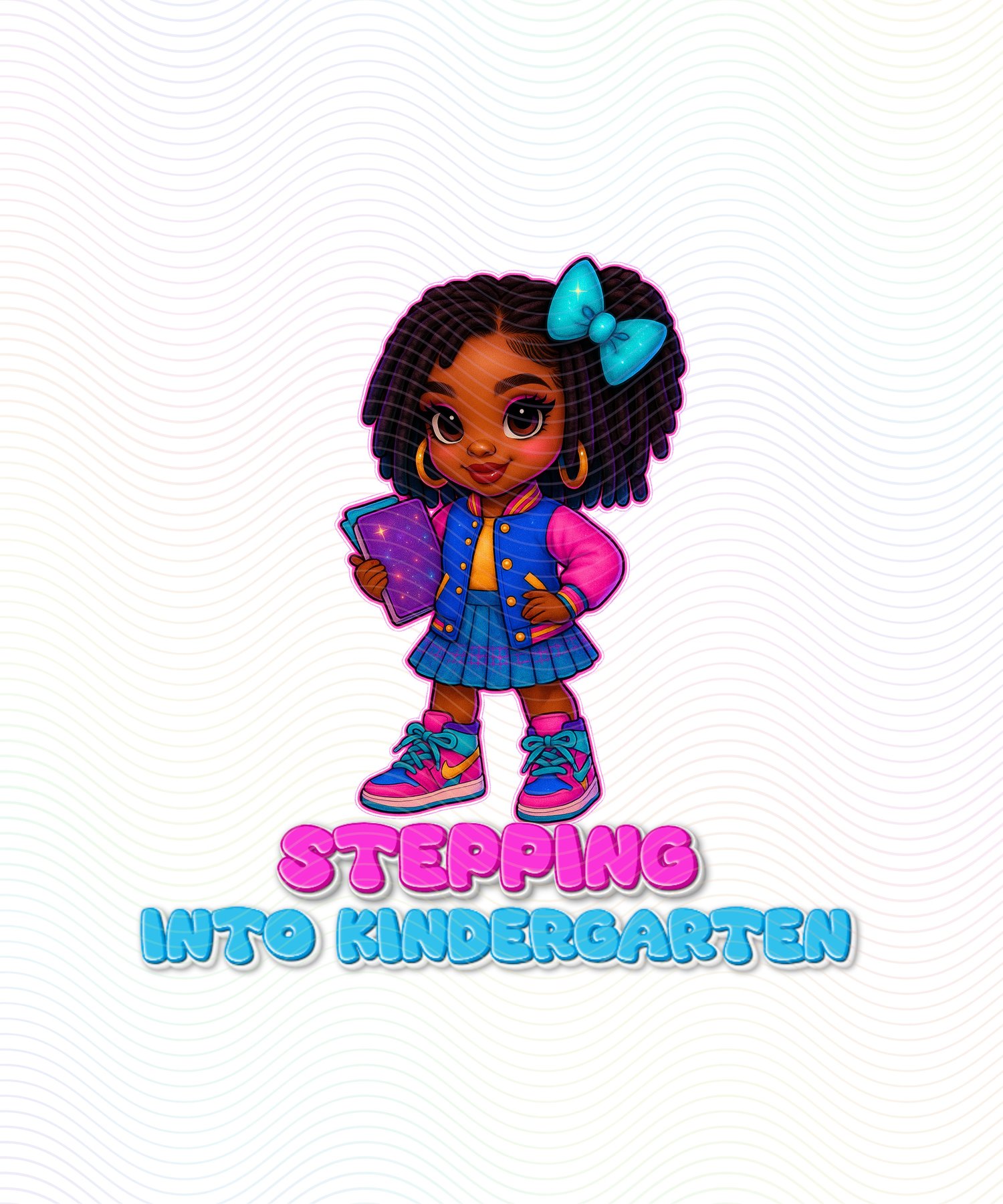 Make those first school days extra cute with this “Stepping Into Kindergarten” PNG design! Featuring a confident little queen with locs, a varsity jacket, a glitter notebook, and colorful kicks, this design is perfect for tees, bookbags, stickers, and back to school party favors. Because kindergarten isn’t ready for all this cuteness!