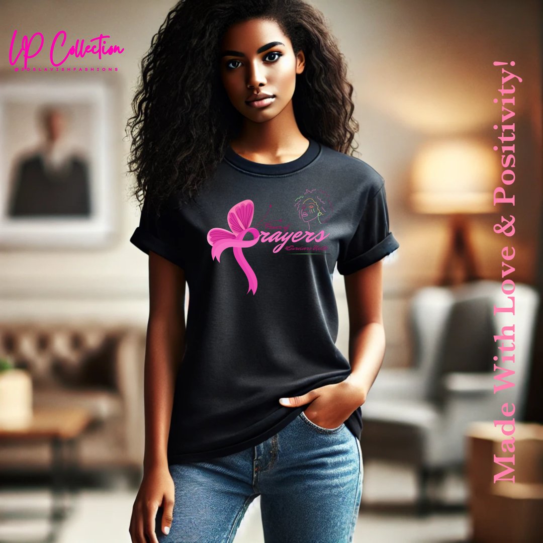 Introducing the Power of Prayers custom tee, a symbol of strength, unity, and hope from the LP Health Awareness Collection. Designed for all survivors and supporters, this stylish tee features a vibrant pink ribbon intertwined with a butterfly—representing transformation, healing, and the beauty of survival. The bold statement "Power of Prayers" alongside the hashtag #SurvivorsUnite showcases the strength found in unity and the belief in the power of community.