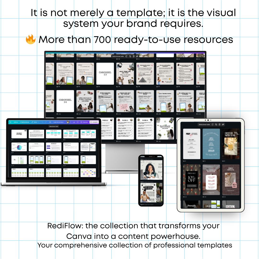 Transform your content, save hours of work, and give your brand a professional look with RediFlow, the ultimate collection of strategic templates for Canva.