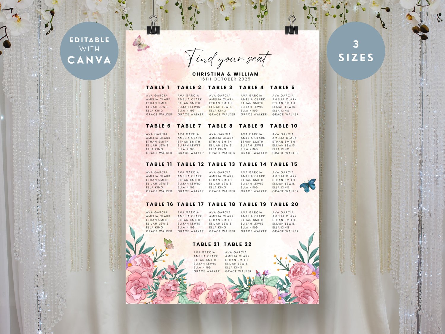Spring Wedding Seating Chart Rose Theme Template Printable Canva Sign Editable Guest Seating Plan For Wedding Reception Table Guide 003