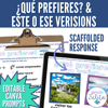 Your students will be engaged with this fun Este o Ese game as they learn about Argentina in Spanish. These 20 prompts include topics like food, drinks, travel destinations, animals, & more! These prompts will engage students as warm-up activities, game days, conversation starters, gallery walk, sub plans & more. This would you rather game is digital on Google Slides, includes a printable gallery walk with note catcher, & printable PDF worksheet version.