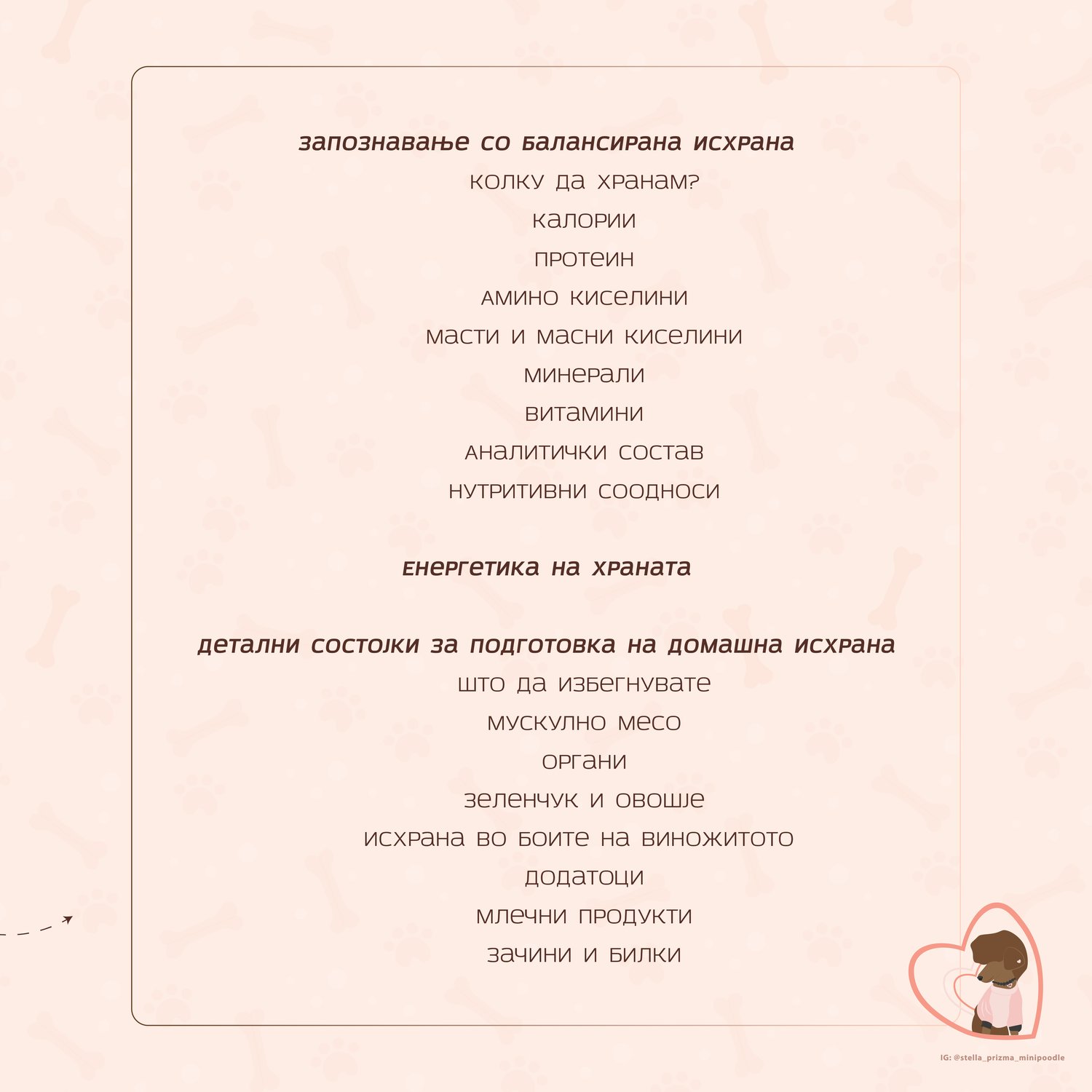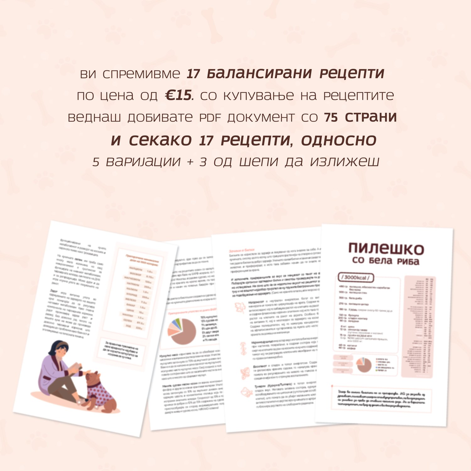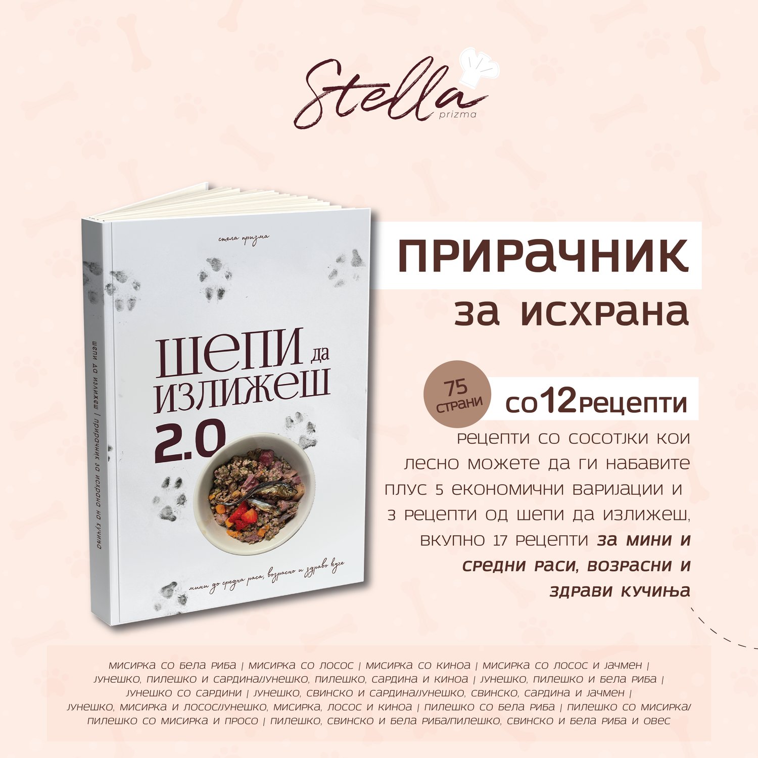2.0 Прирачник за исхрана на вашето куче, спремен за да ви помогне да се запознаете со еден поинаков пристап на исхрана и енергетика на храна. Овој прирачник е со рецепти без коски и едноставни состојки кои может лесно да ги најдете.