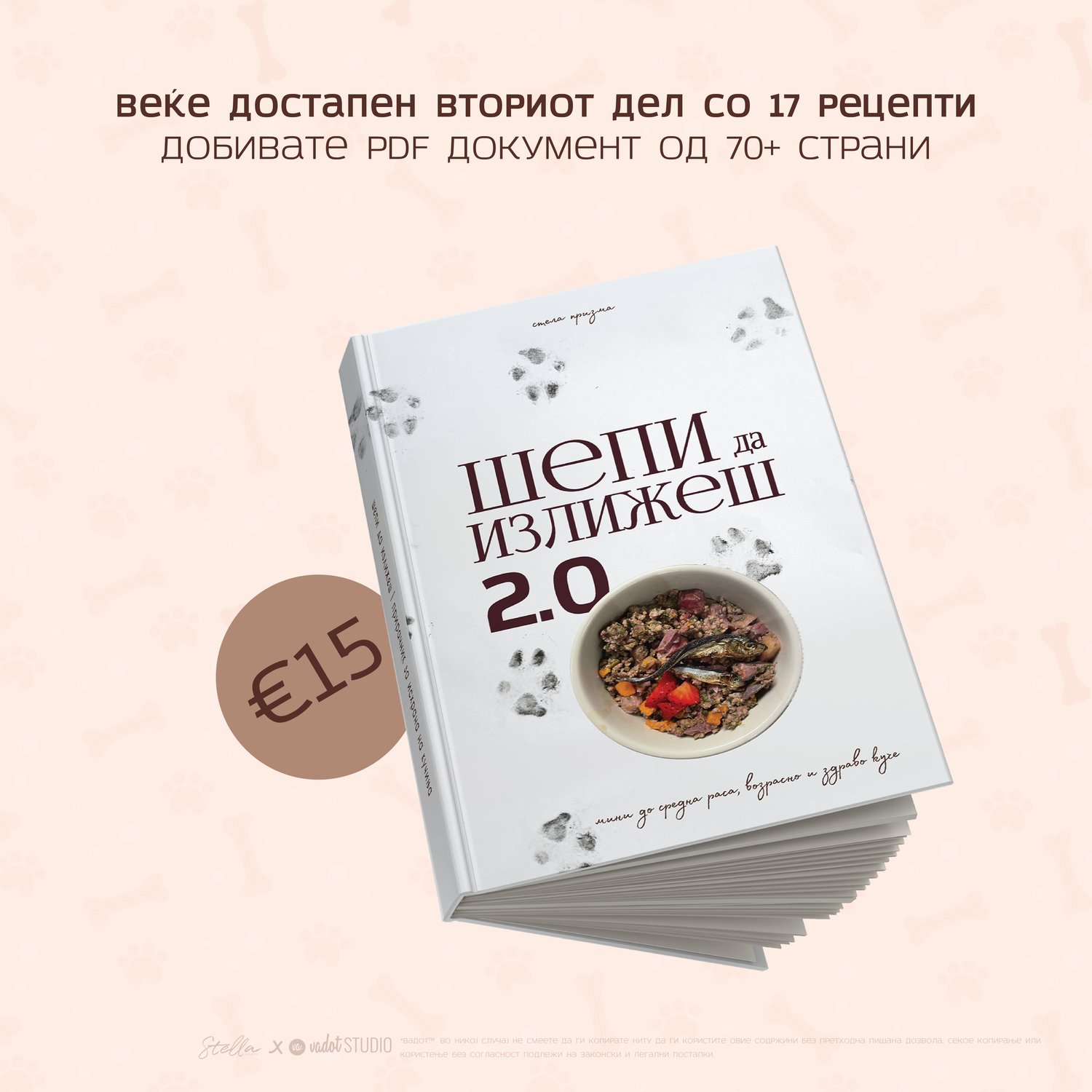 Овој мини прирачник се состои од 75 страни, со 12(+5 економични варијации=17 рецепти) комплетно балансирани рецепти за вашето возрасно и здраво куче. Интересното е тоа што сите состојки во овој дел се прелесни да се најдат и така се направени за да ви го олесниме целиот процес на купување и барање состојки, 5 рецепти се со варијации за поекономични верзии, а 3 се од првиот дел на "Шепи да Излижеш".