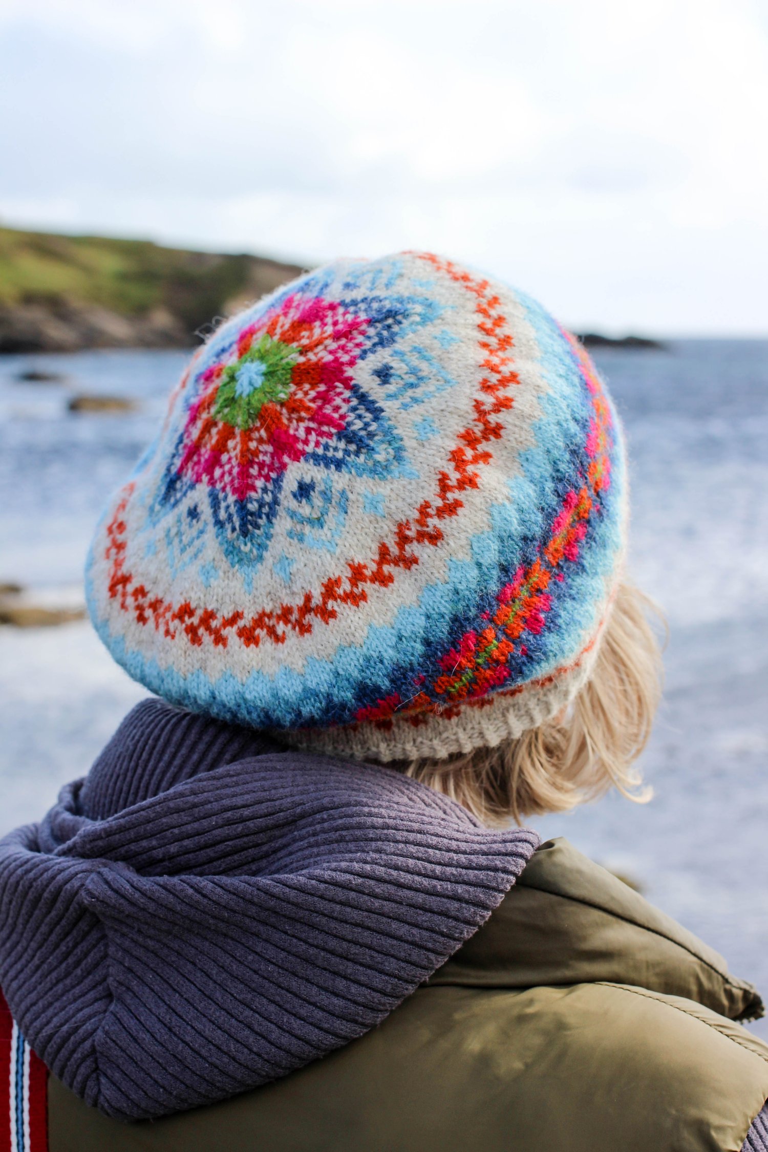 The small motif in this design is one I’ve used before and it reminds me of an Up Helly Aa shield from 2006, the name Einar which means one, alone & warrior in Old Norse was the Guizer Jarls name and its fitting for this hat too as its one, repeating motif the whole way up.