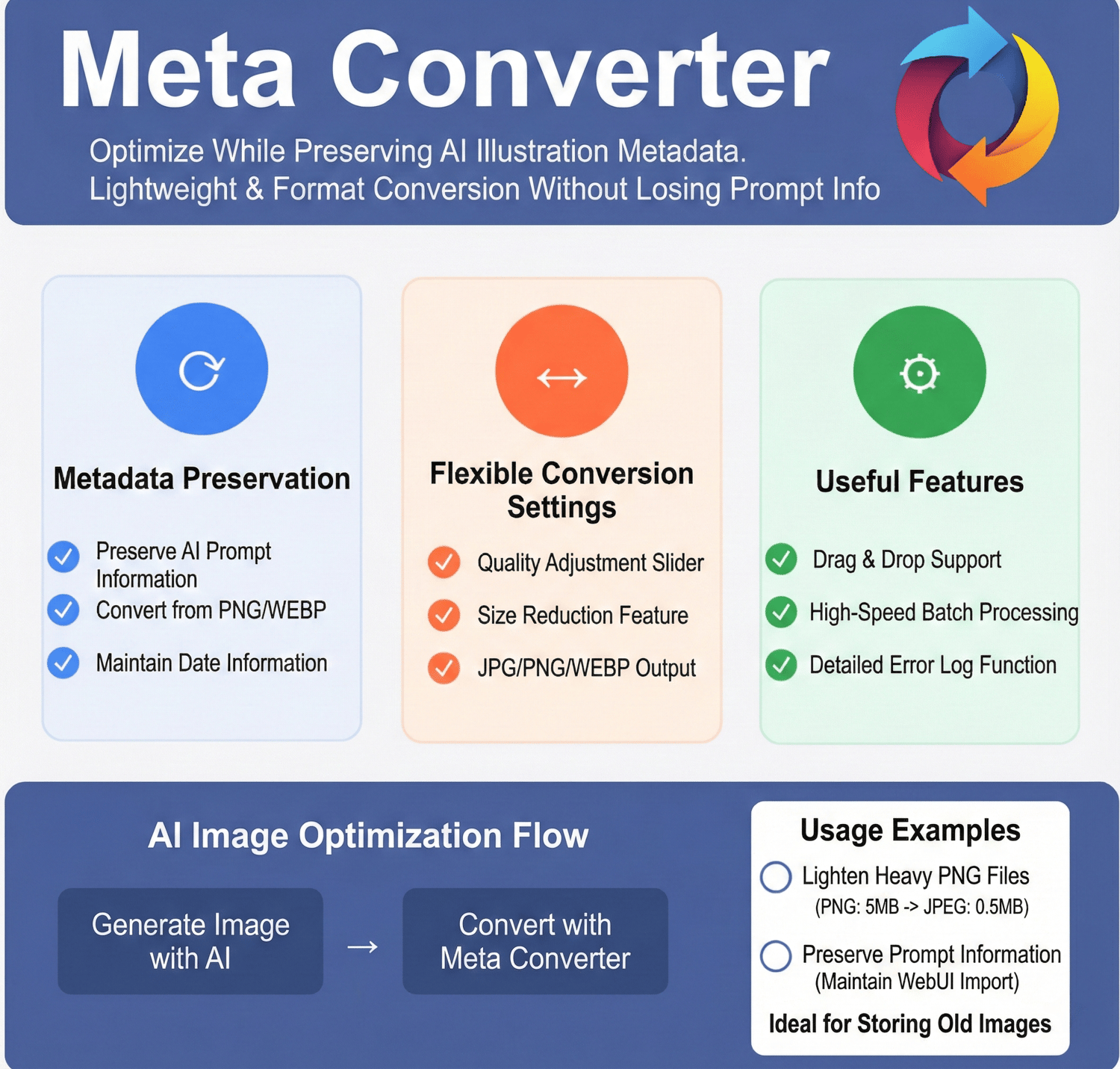 Meta Converter is a tool that converts multiple images to PNG / JPEG / WEBP while preserving metadata.