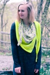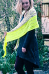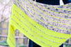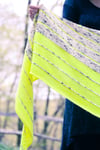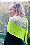 Bold strokes of alternating smooth and rough texture stretch fluidly across this asymmetric shawl. The strict monochromatic palette is broken with colorful accents that transition to dominance at the far edge; try pairing a speckled yarn with a bold contrast for a striking visual result.