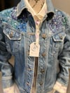 This Rubbish brand size medium jacket features large florals by artist, Jenn Hunt. Her exclusive design, done in gorgeous purple, blue, teal, and, green florals has been hand-painted on the back center panel and front shoulders. Faux pearls and rhinestones are sprinkled throughout accentuating the florals. This jacket is a heavy-weight-density fabric. Chest pockets only.