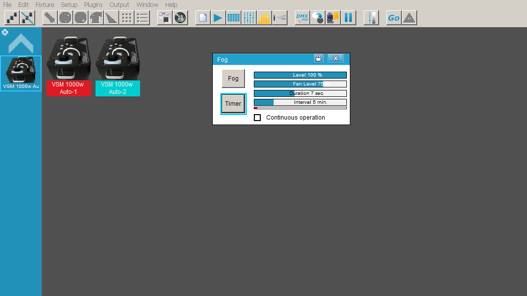 Con el Botón de “Fog” disparan humo mientras que esté presionado el botón. Al soltar apaga. Si activan el box de “Continuos Operation” queda apretado el botón por lo que largará humo hasta que lo vuelvan a presionar.