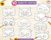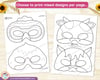 This pack includes TEN farm animal masks in black line, to print: cow, horse, pig, sheep, chicken, duck, goat, donkey, cat and dog.