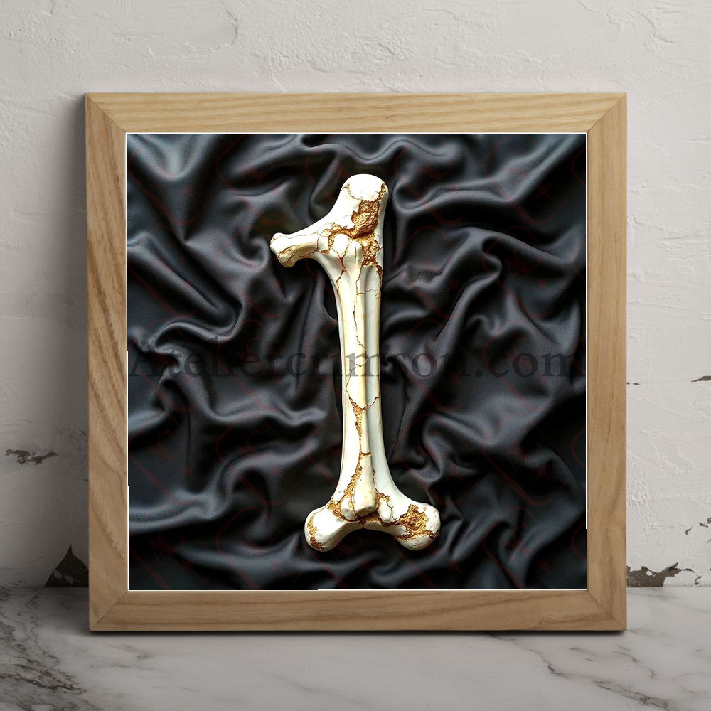 Number 1 Bones with gold fissures A hauntingly beautiful character crafted from pristine human femur bones, intricately arranged to form a bold, serif typeface. Delicate golden fissures, reminiscent of kintsugi art, weave through the ivory-white osseous structure, adding an element of elegant repair. The character stands proudly on a luxurious marbled floor, its form casting subtle shadows. Behind it, a textured black linen backdrop provides a striking contrast, emphasizing the letter's ethereal beauty.