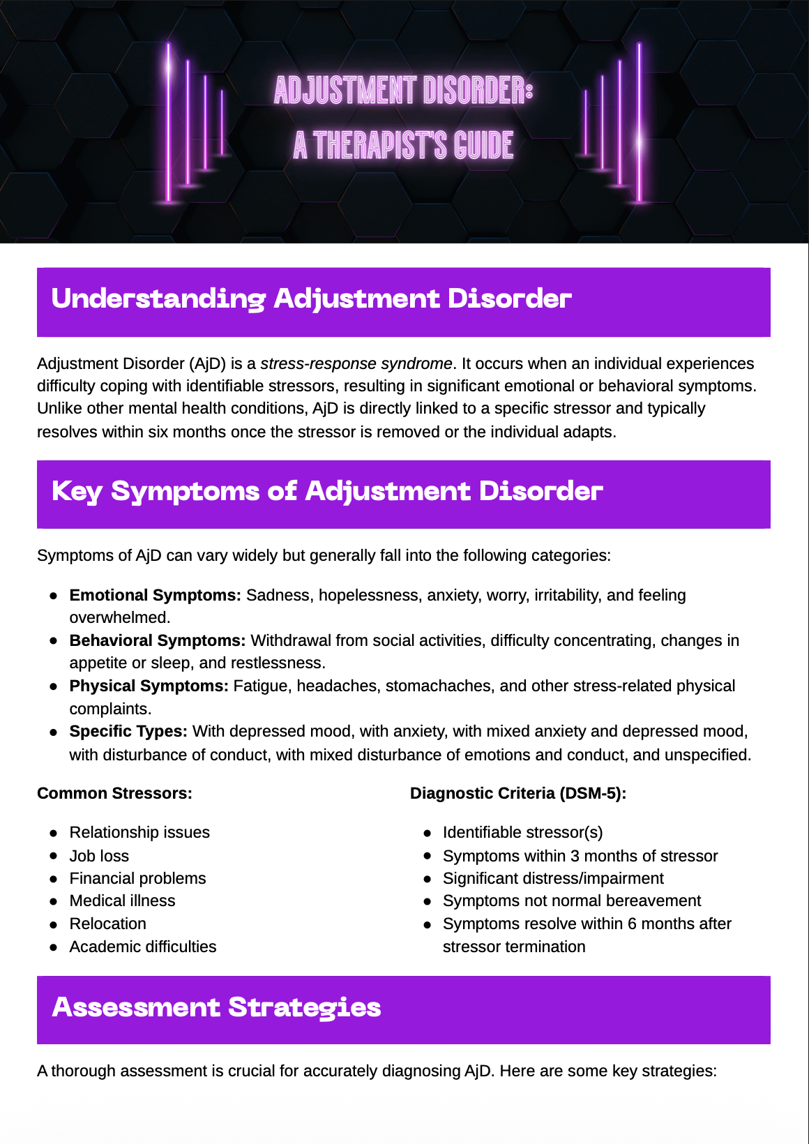 Whether you are reviewing diagnostic criteria, refining assessment approaches, or exploring supportive interventions, this guide offers a helpful starting point for understanding and addressing adjustment-related concerns in therapy.