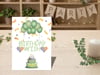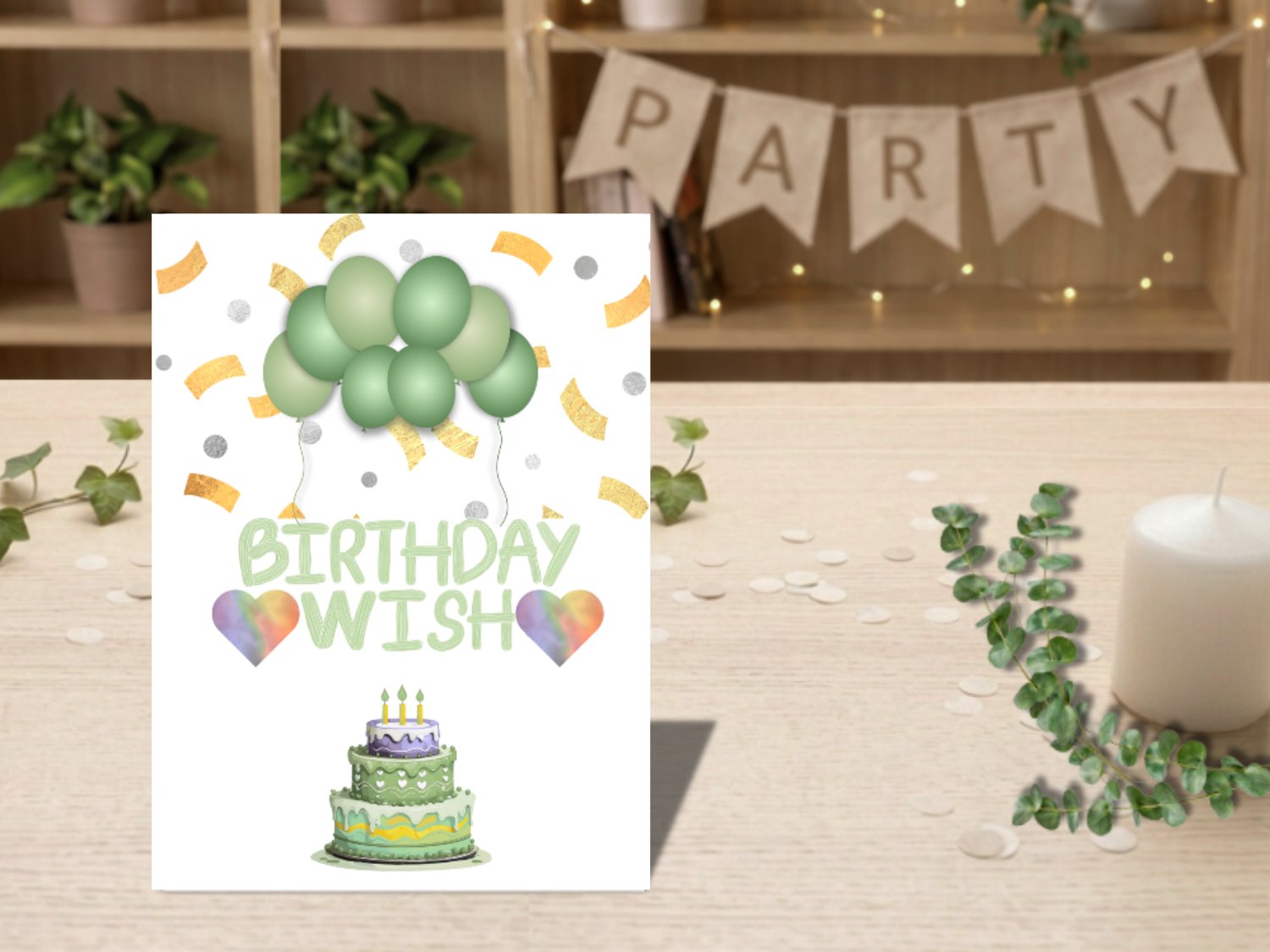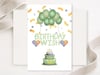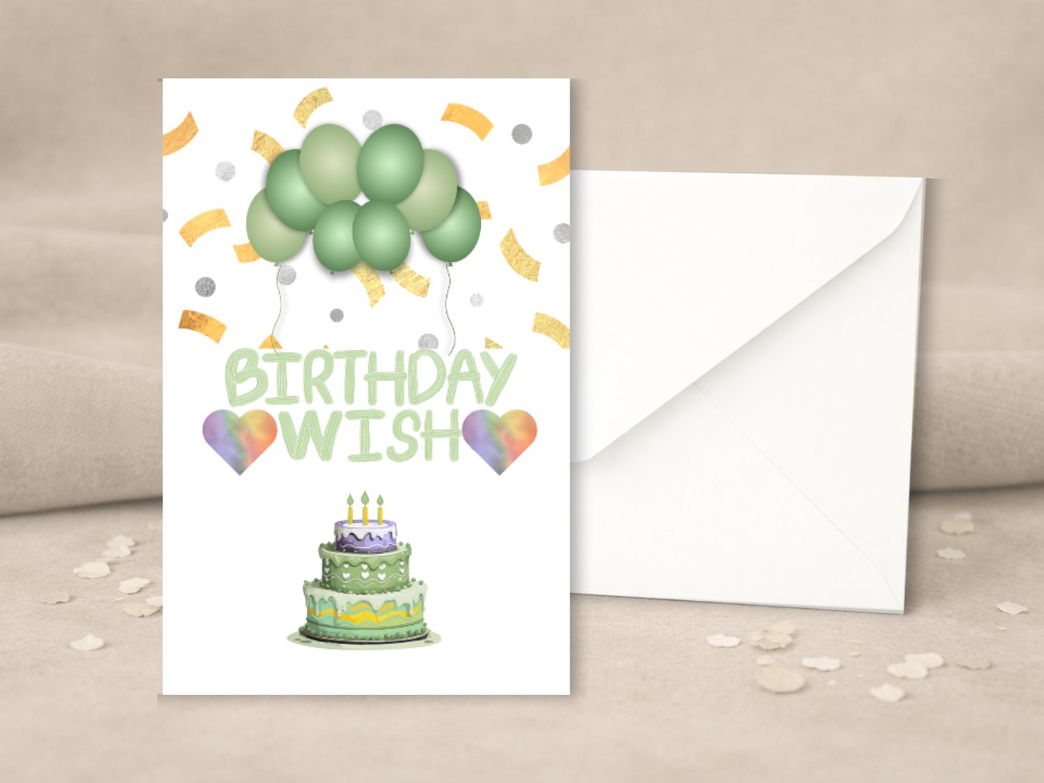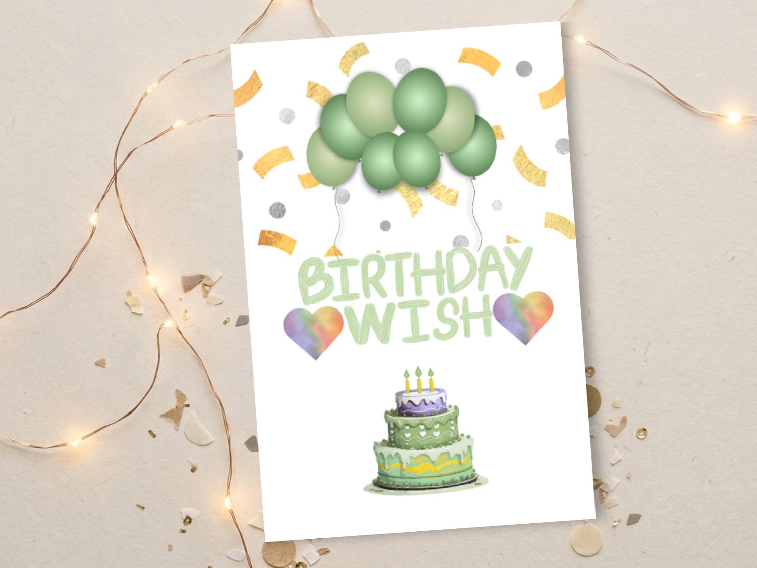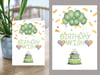Send birthday cheer with this soft pastel green foldable card featuring balloons, confetti, a sweet cake, and heart accents. Perfect for any age and occasion!