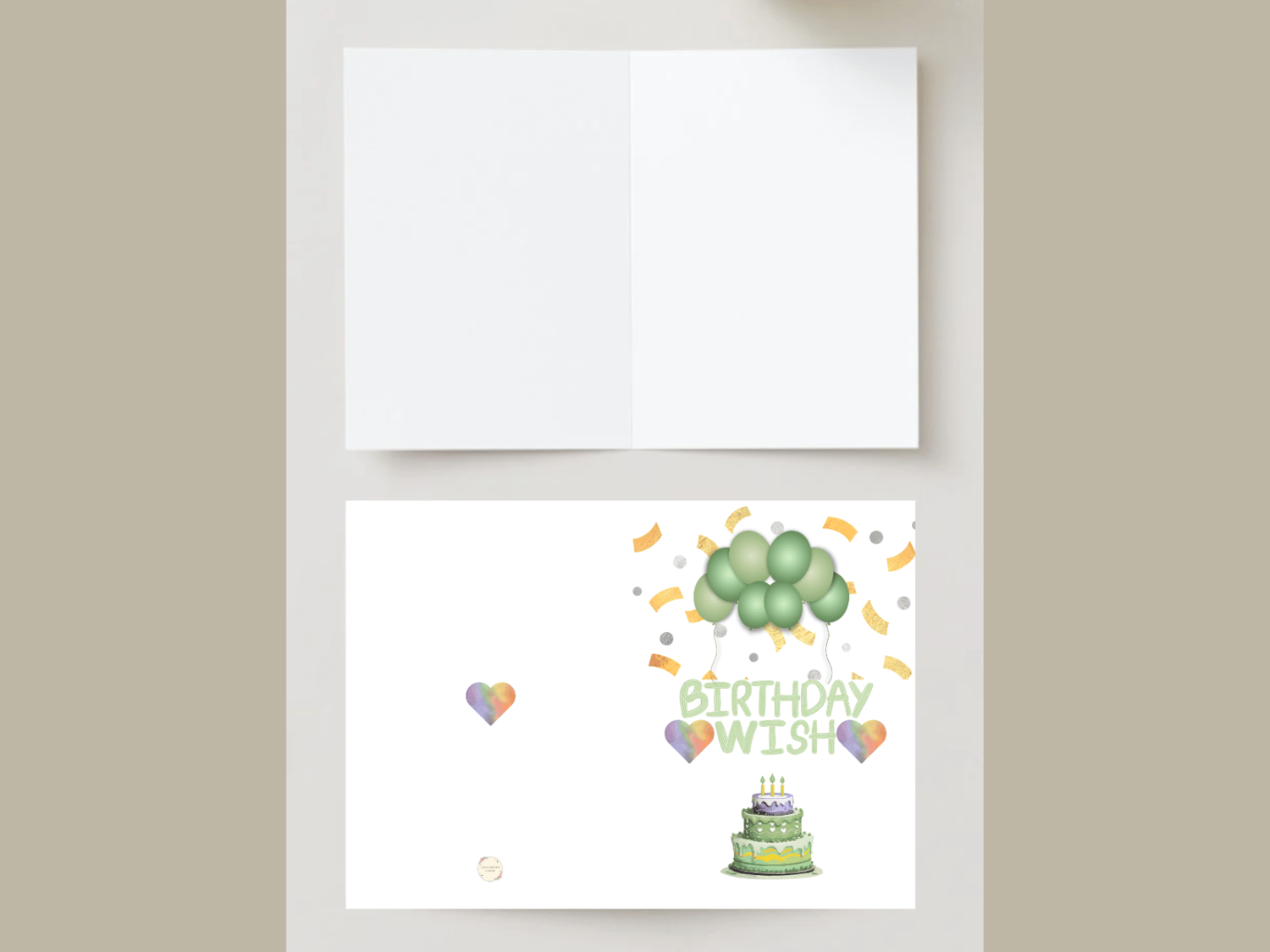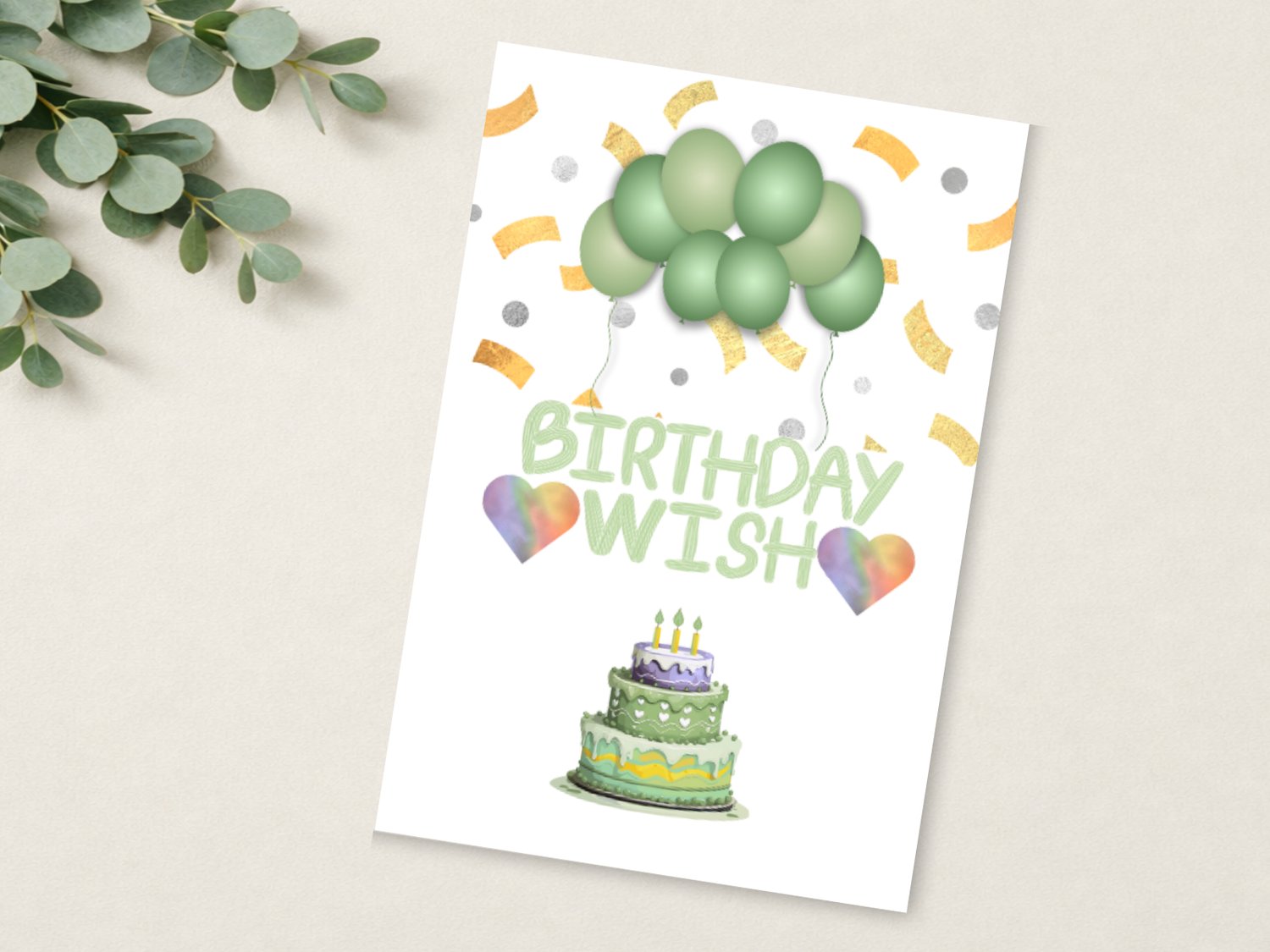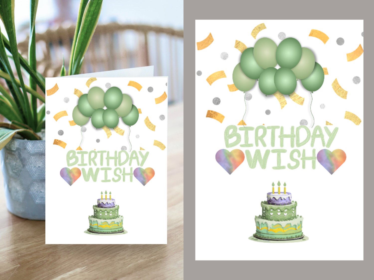 Birthday Wish Folded Card – Pastel Green with Balloons, Cake & Hearts
