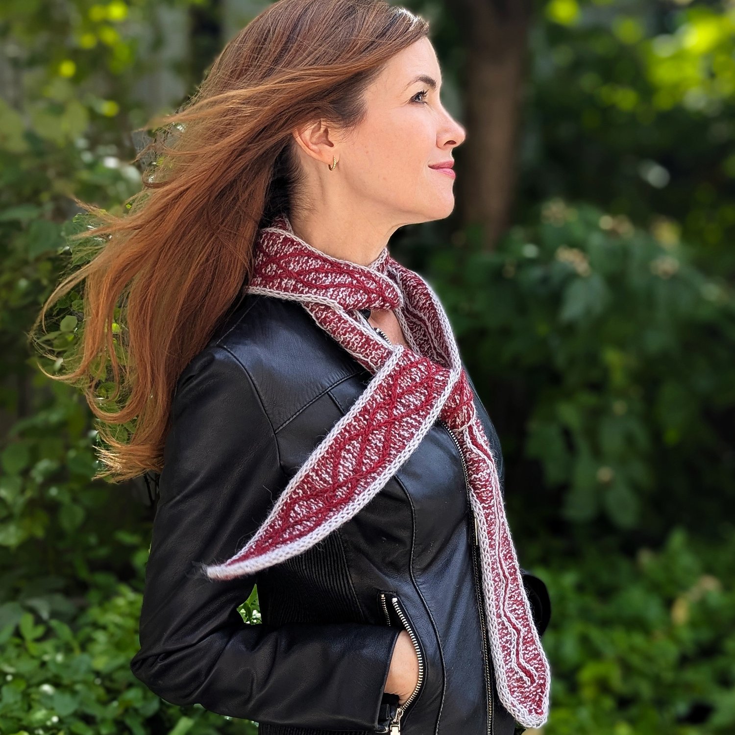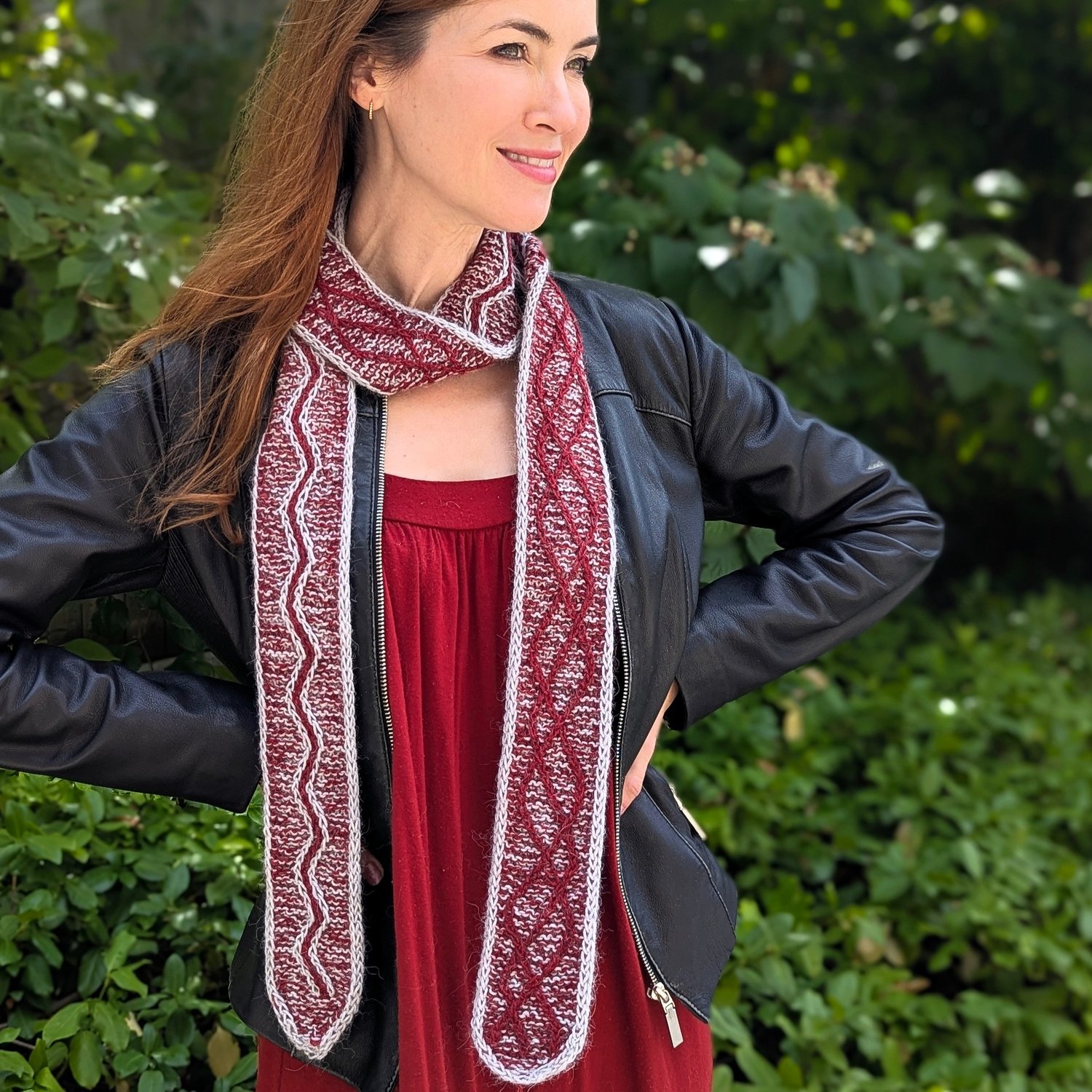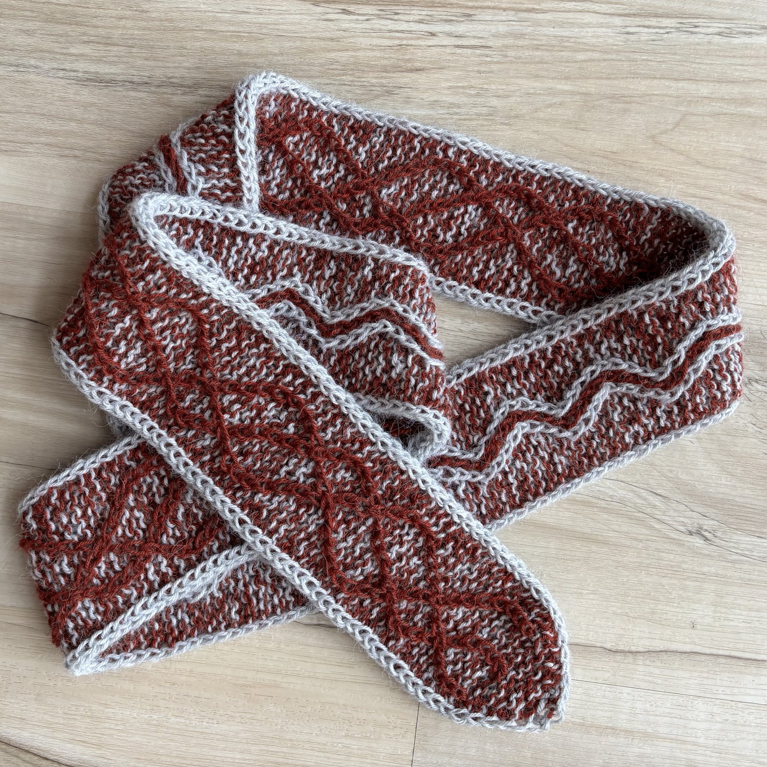The Fission Festival scarves are worked with 2 yarns held together in a marl. The reversible design is created with Fission Knitting; the Fission Knitting Tutorials are available for all the cables.