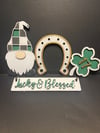 St. Patrick's Day set for interchangable wagon includes a Gnome,horseshoe, Shamrock and a Lucky and Blessed sign with hooks. They range in size 3-8" and are sold either painted or unpainted.