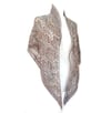 Dinosaur Crossing is worked sideways from one tip to the opposite tip. A wide lace and cable border swoops along the bottom of the shawl while garter stitch rows form a small body along the top. Easy short rows help to create the crescent shape.