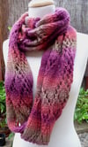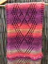 Gothic Rose is worked in one piece from end to end. A garter stitch border surrounds the lace central panel, which uses simple stitches to great effect. Buttonholes are worked at one end and buttons are attached to the other after blocking.