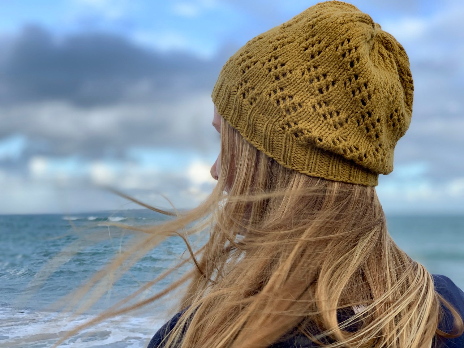 This beanie is knit in the round from the brim upwards. 2x2 ribbing leads into a simple lace stitch pattern that opens beautifully with blocking. Simple crown decreases help to accentuate the slouchy nature of the fit.