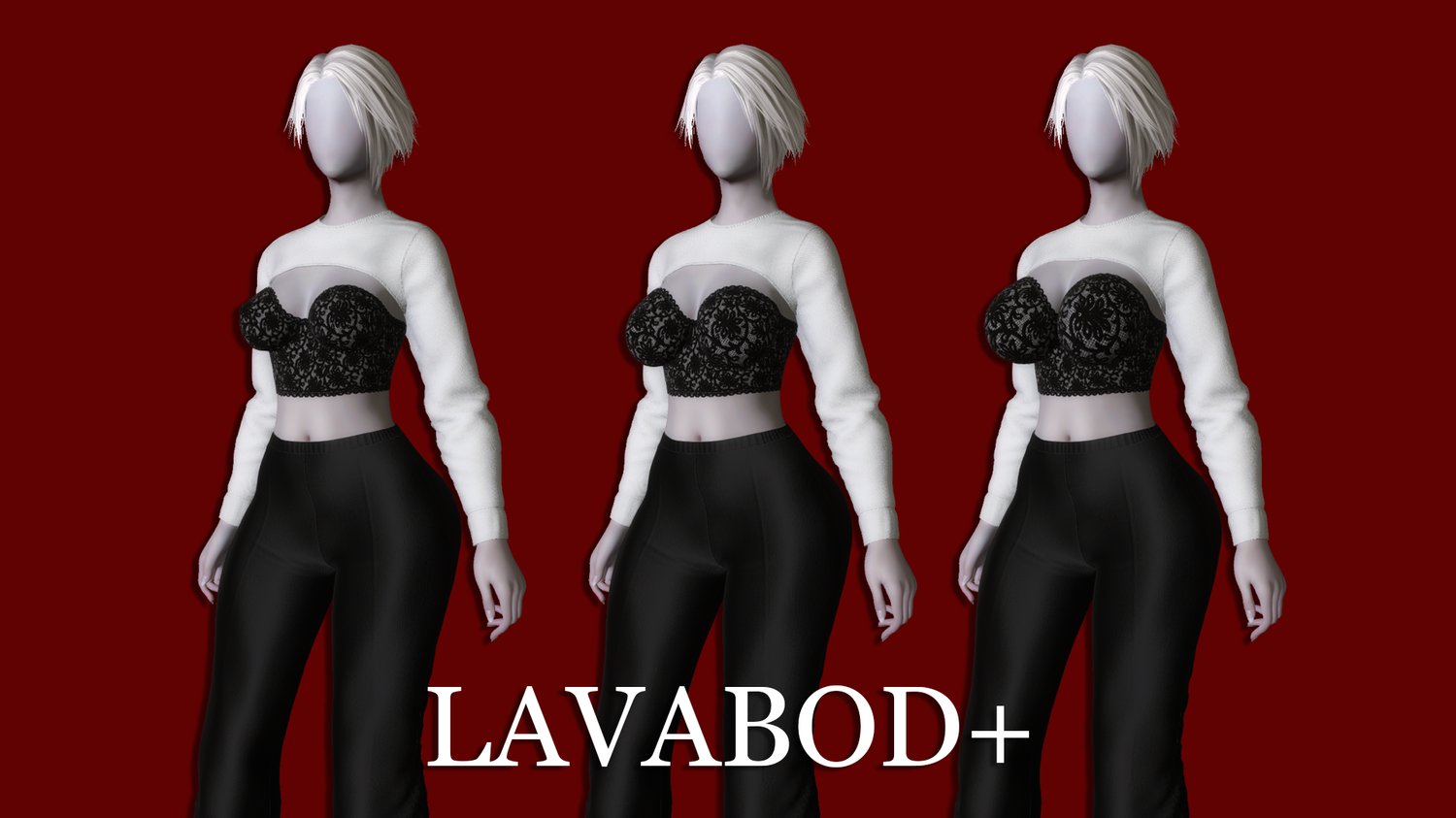 Outfit is assembled of a sheer bra with a wool bolero, velvet sweatpants, and heels. Features toggles for top, four patterns for bra, two velvet intensities for pants, and dual dyeing. Toenails for YAB+, Rue+, and LavaBod+ heels use Yet Another Manicure+ and utilizes dual dyeing.