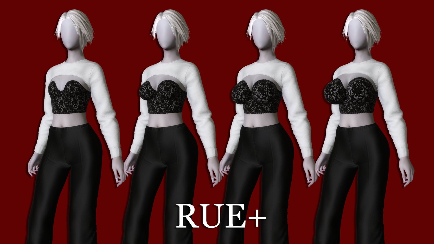 Custom mesh and textures. Created with Blender, Substance Painter, and Photopea. Thumbnail shows outfit on UranusRE (Rue+) w/ LaRue+ Standard legs with Customize+ on.