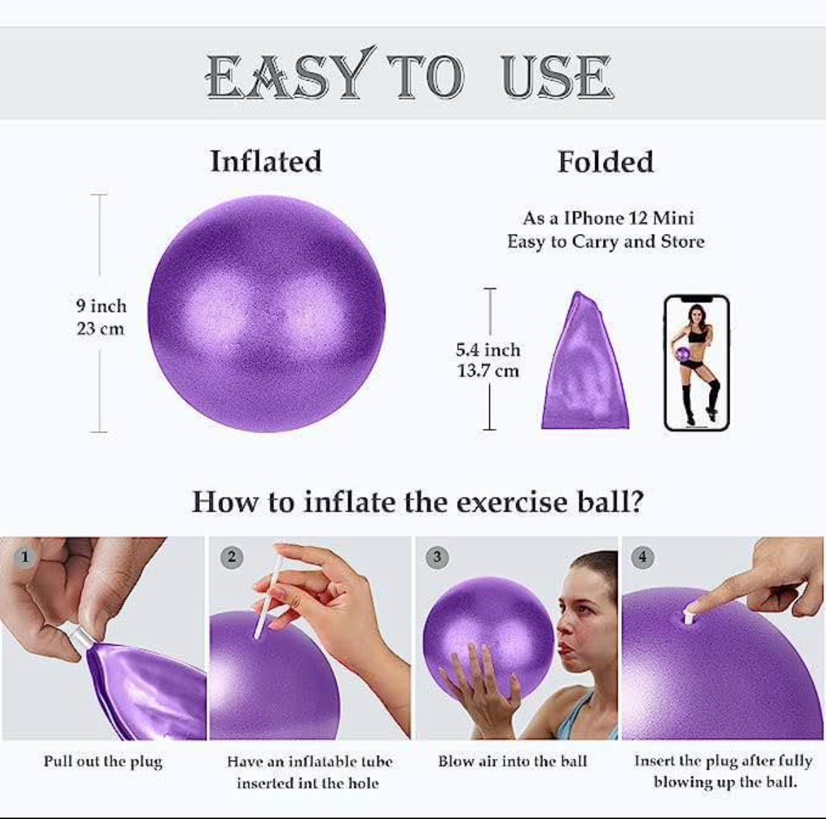 The Pilates Ball is designed to be easy to use. It can be inflated with the included tube and breath, and a pump is not required. The ball has a folded size as an iPhone 12 mini, making it convenient to carry and store.