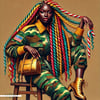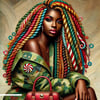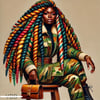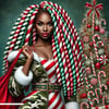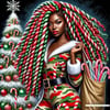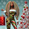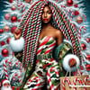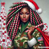 This vibrant digital oil painting features an African American woman with long, candy cane-colored cork twists that radiate festive charm. Her outfit fuses military-inspired camo with bold red and white patterns, blending the strength of camouflage with the vibrant spirit of the holiday season. Standing confidently next to an ostentatious Christmas tree, decorated with an abundance of candy canes, she holds Santa's gift bag, exuding both elegance and holiday cheer. The scene beautifully merges military influence with seasonal splendor.