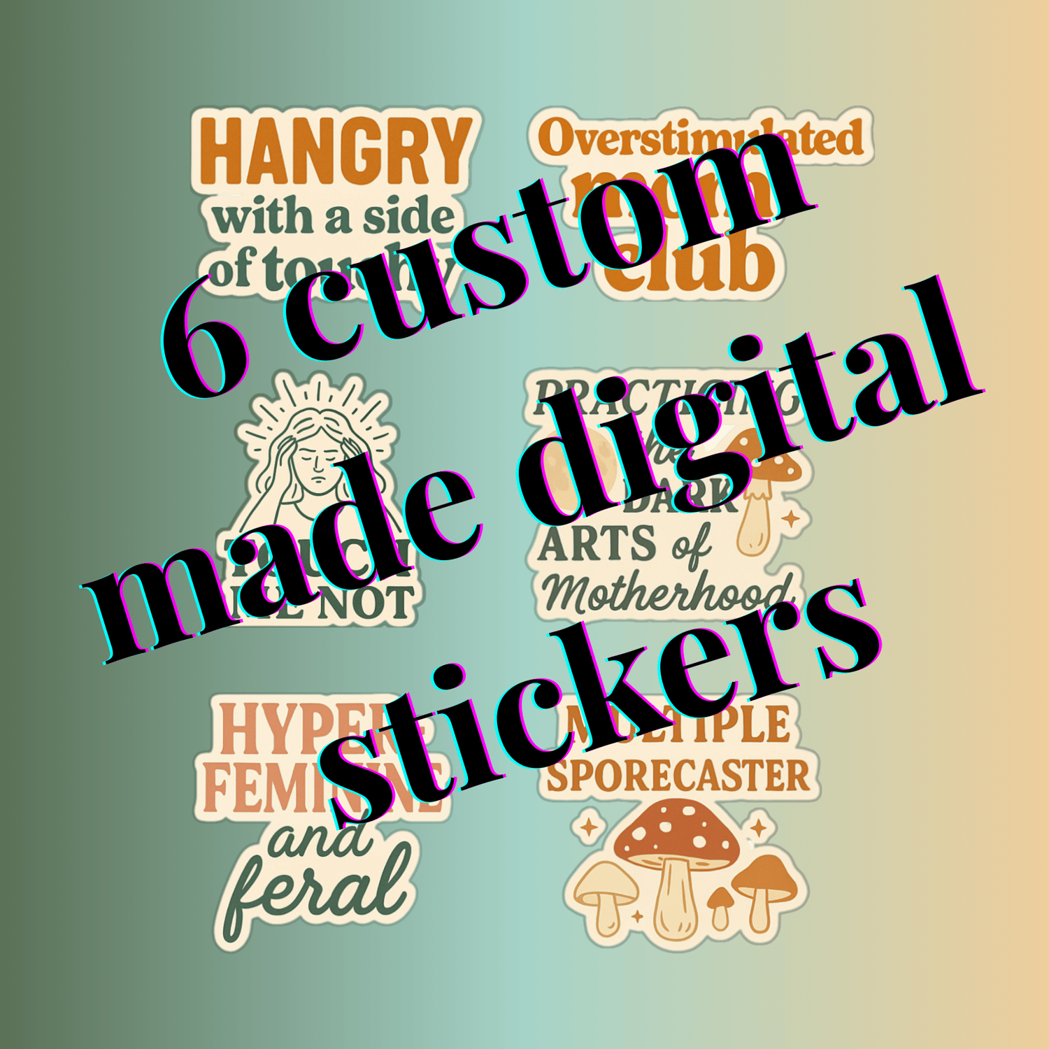 This 6-pack of original digital stickers was made for you — the overstimulated, under-validated, mushroom-loving mamas. Stick ’em on your digital planner, Insta story, Canva designs, or wherever you need a visual exhale. Or print yourself!