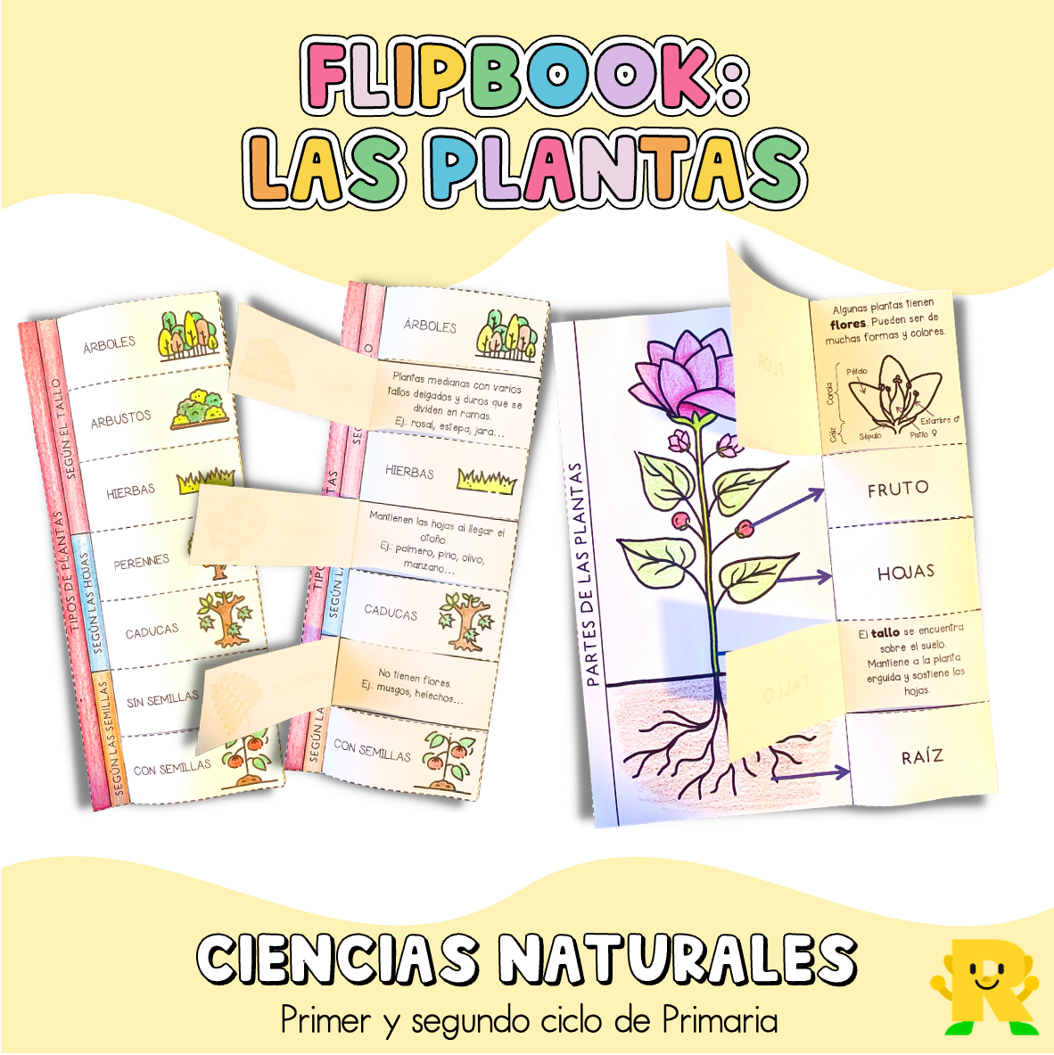 El flipbook de las partes de las plantas podéis montarlo como prefiráis. Por ejemplo, pegar en el cuaderno la página 2 y que los alumnos escriban en las hojas de su cuadernos, bajo las solapas, la teoría; o que los alumnos peguen la página 2 sobre la página de teoría; o usar sin formato flipbook (solo páginas 5-9).