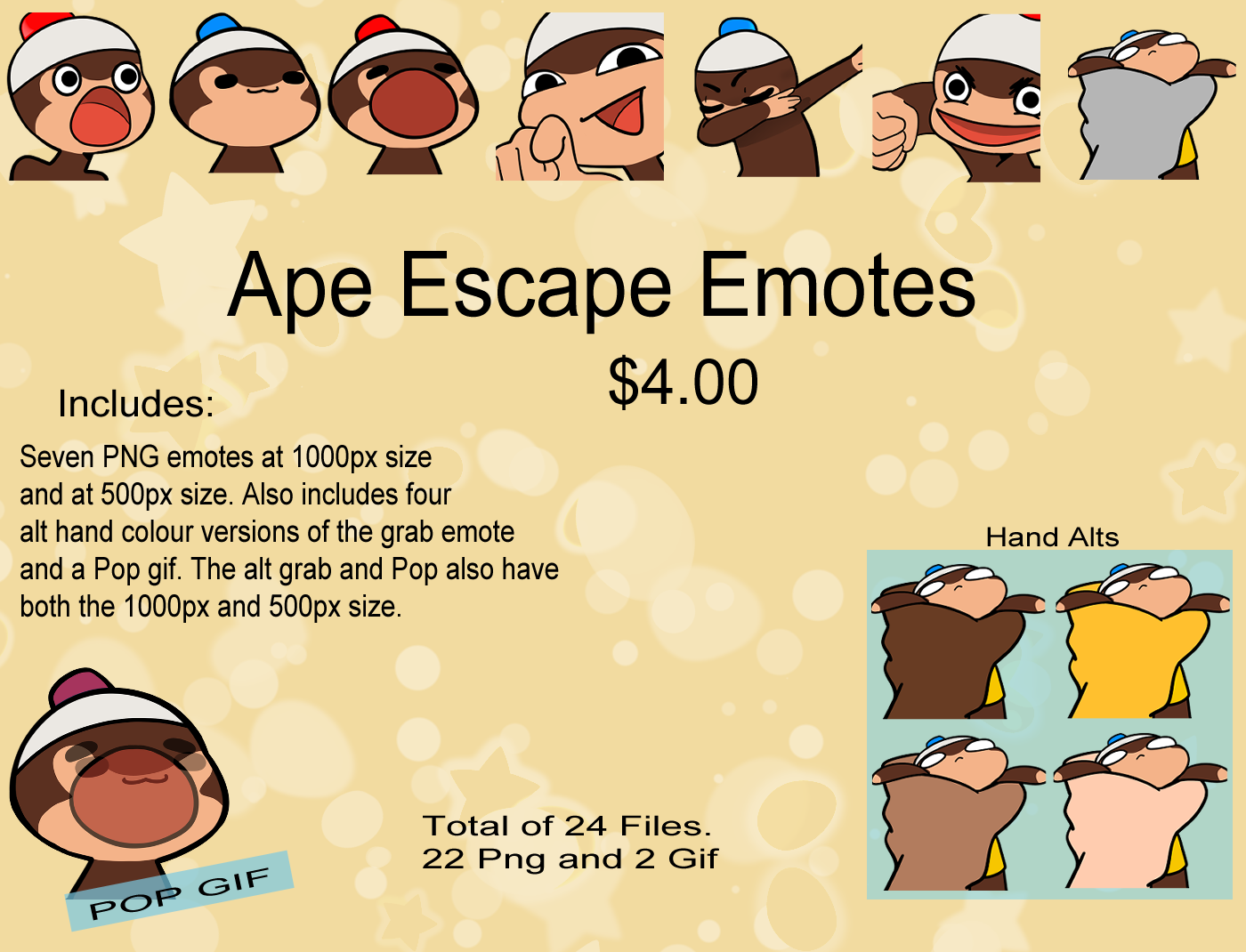 Ape Escape is a Trademark of Sony Computer Entertainment INC which owns the rights to Ape Escape. By buying this you're not buying the rights specifically to the characters, However, you are buying the right to use the content in this pack as much as you'd like as long as it doesn't breech the terms and services of the content. These emotes are made from referencing Loumon's Emote Base. Loumon can be found over on (X)Twitter. Permission was secured before creating and selling these emotes.