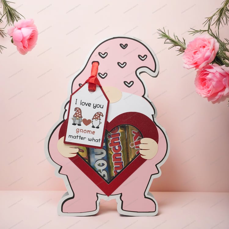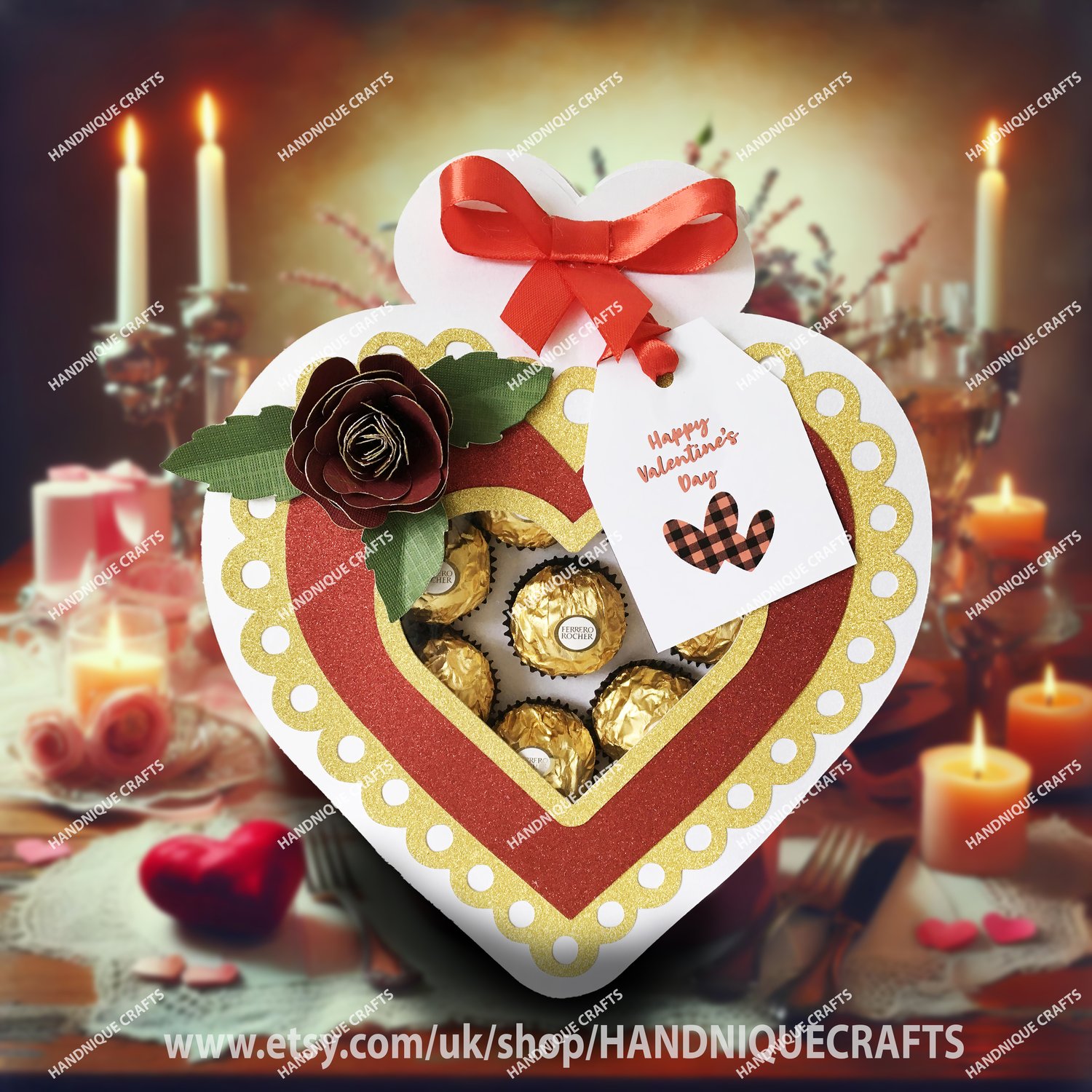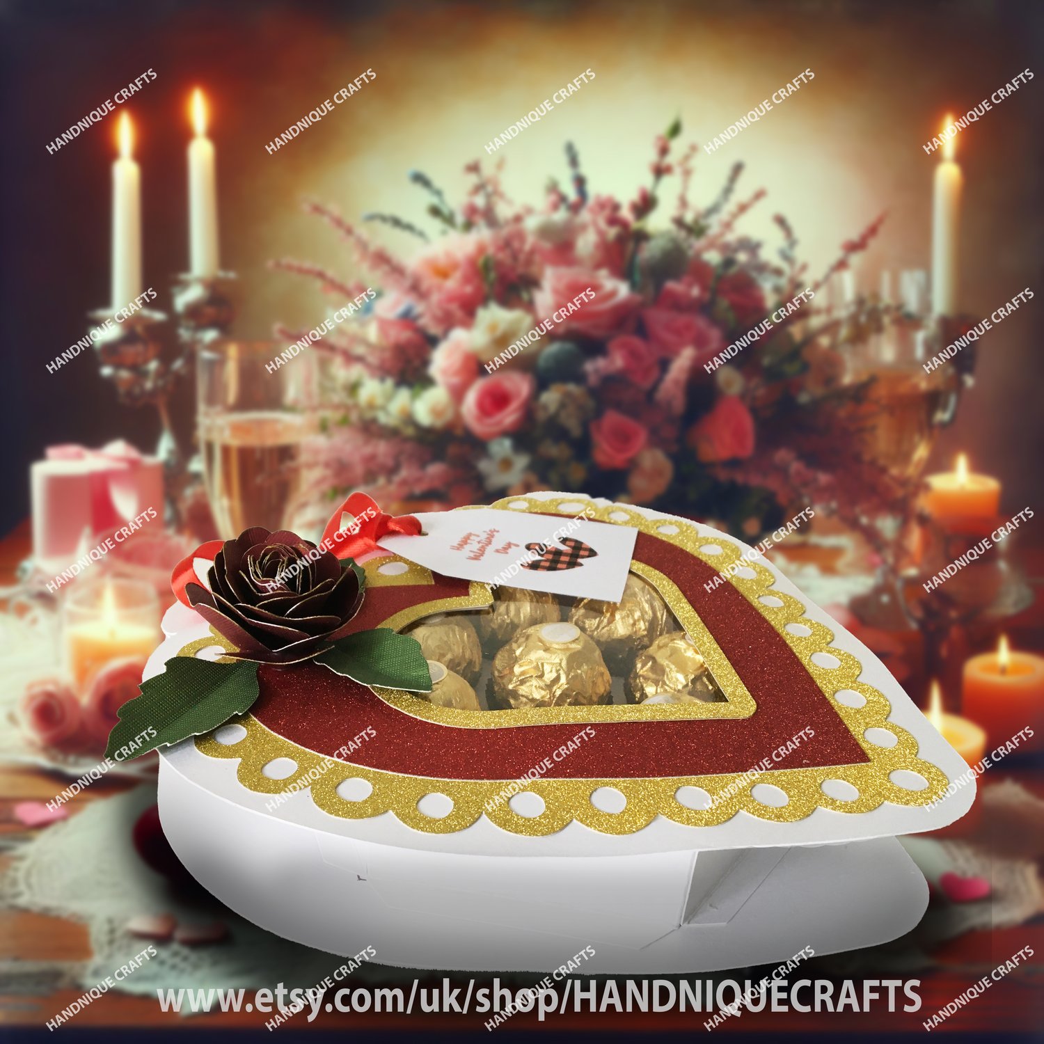 Heart-shaped Valentine's Day chocolate gift box, likely designed to be a romantic gift. The box has a layered design with white, gold, and red accents, featuring decorative scalloped edges and polka dots along the border. A red rose made of paper, along with green leaves, adds a touch of elegance to the top of the box. Inside the box are multiple pieces of chocolate wrapped in golden foil. Fits 8 Ferrero Rocher, , enhancing the luxurious and thoughtful appearance of the gift.