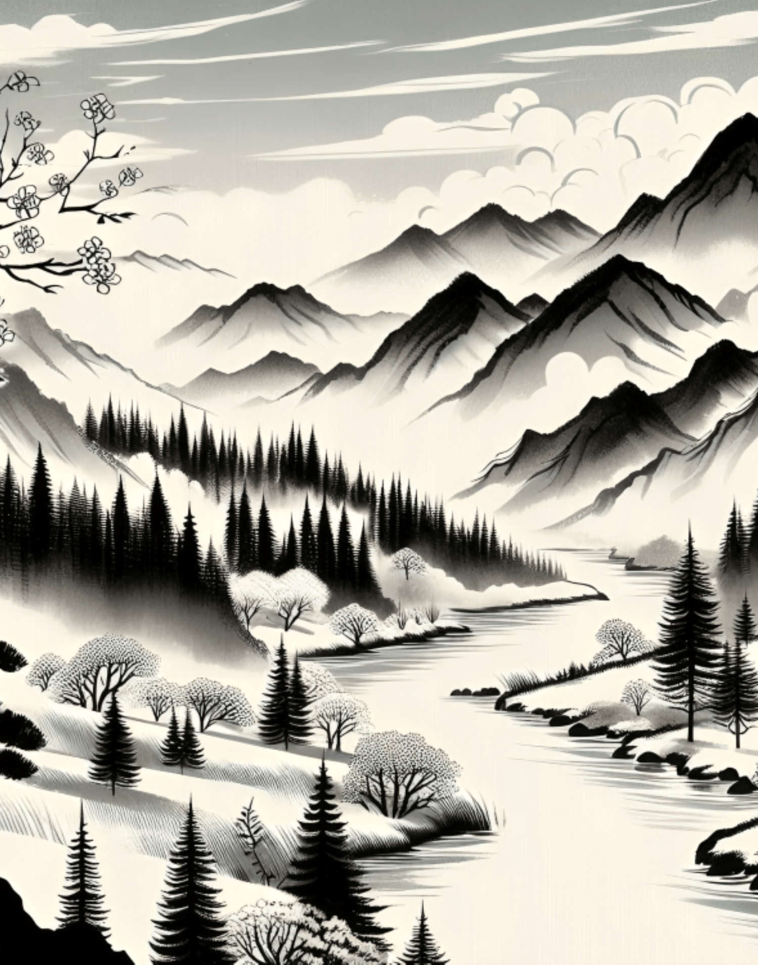 Japanese Ink Style Painting, River, Mountain, Vintage Village, Top Art, Nostalgic Rural life, Nature, Cool Nature, Beautiful Nature, Sunrise, Natural Landscape, Wall Art, Digital Art.