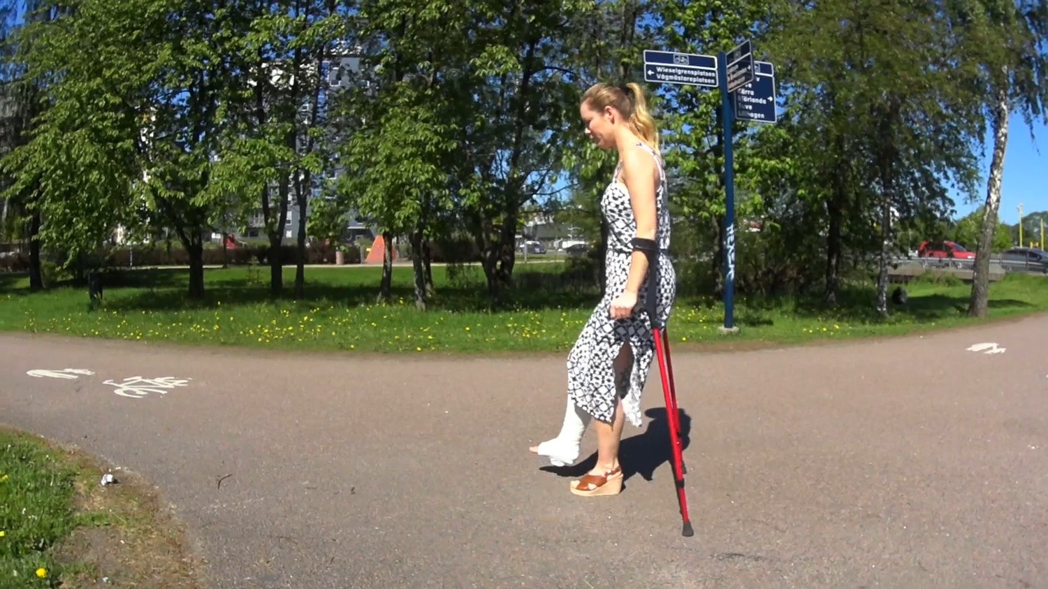Melinda crutch from the car on her way to a shopping center.She first walk through a park before crossing the street to get to the shops.We following her up and down a escalator before she returns to the car.
