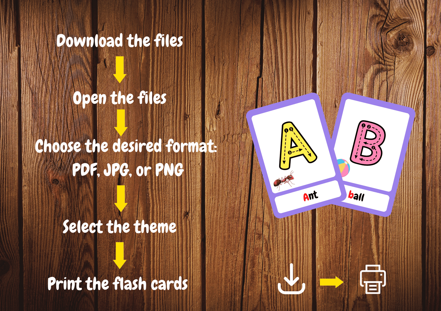 You can easily print the provided flash card files in three different formats: PDF, JPG, and PNG.